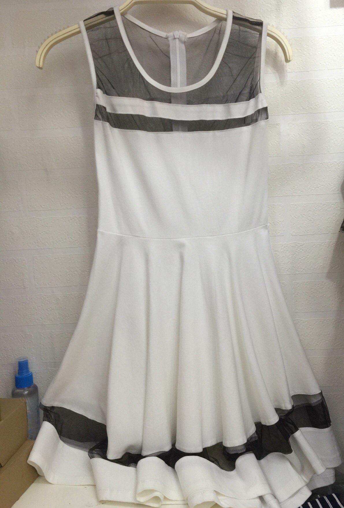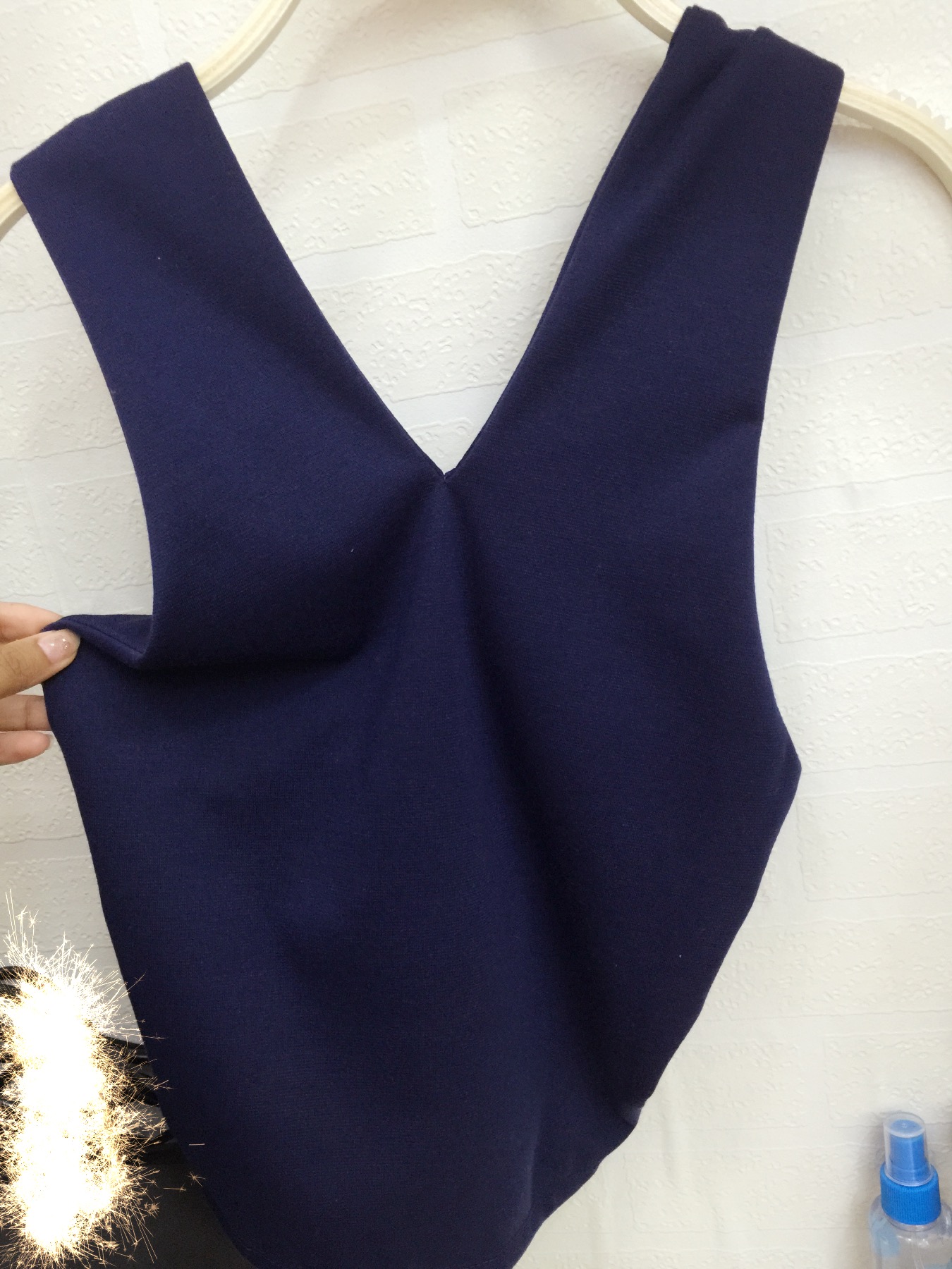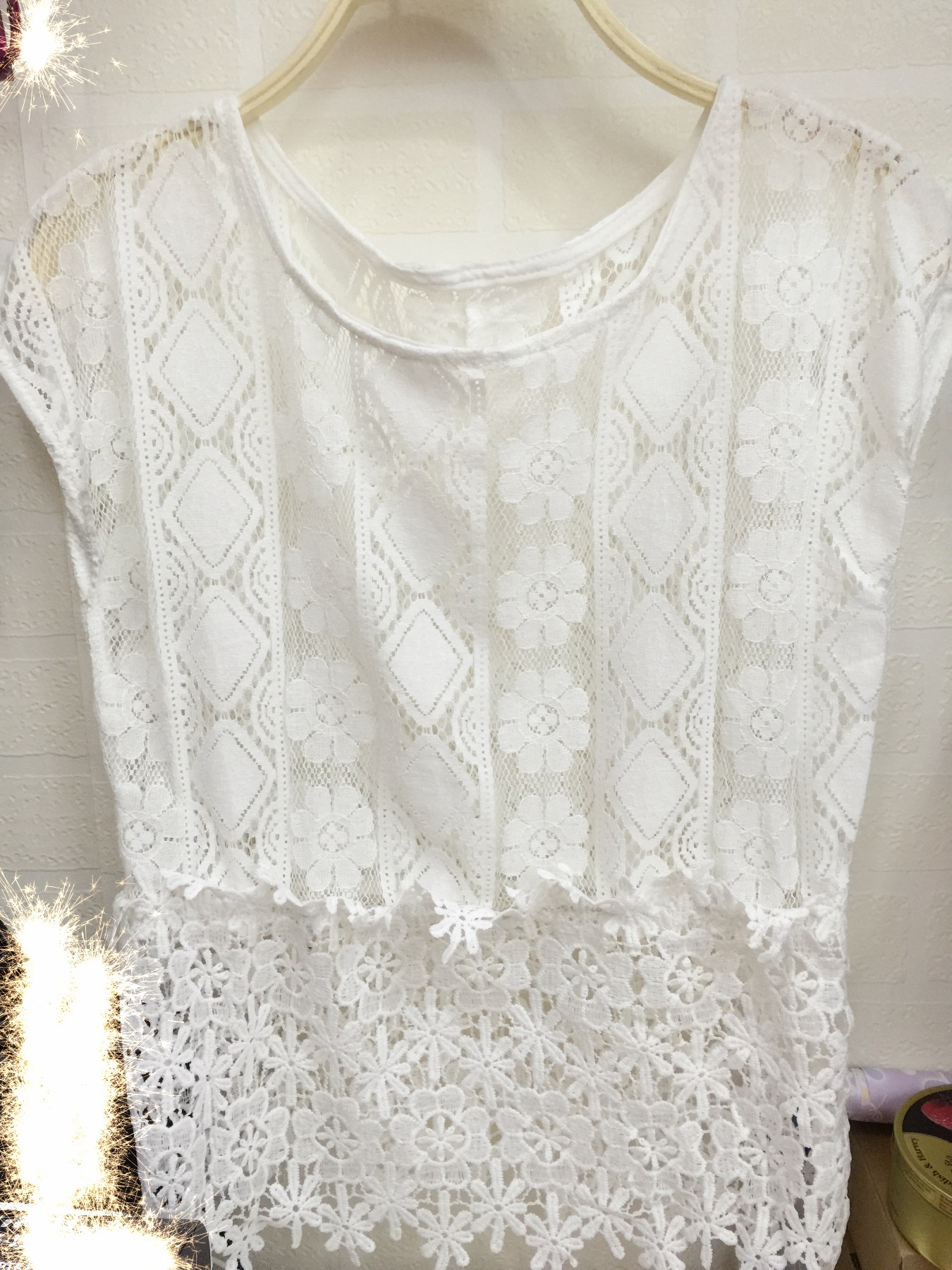 无袖T质量很不错的,但是没弹力,一点弹力都没有~12块,地下的花边很美腻~