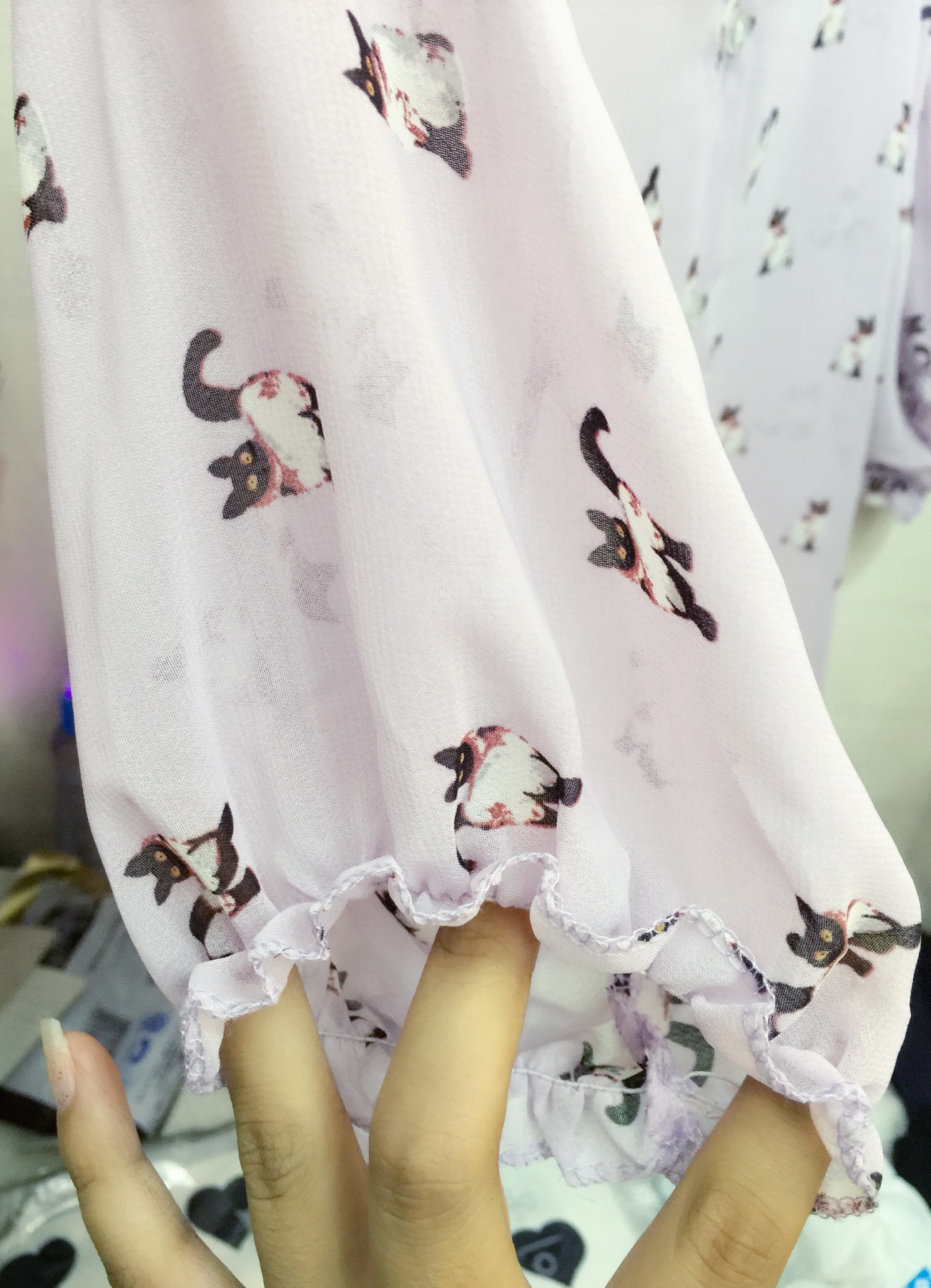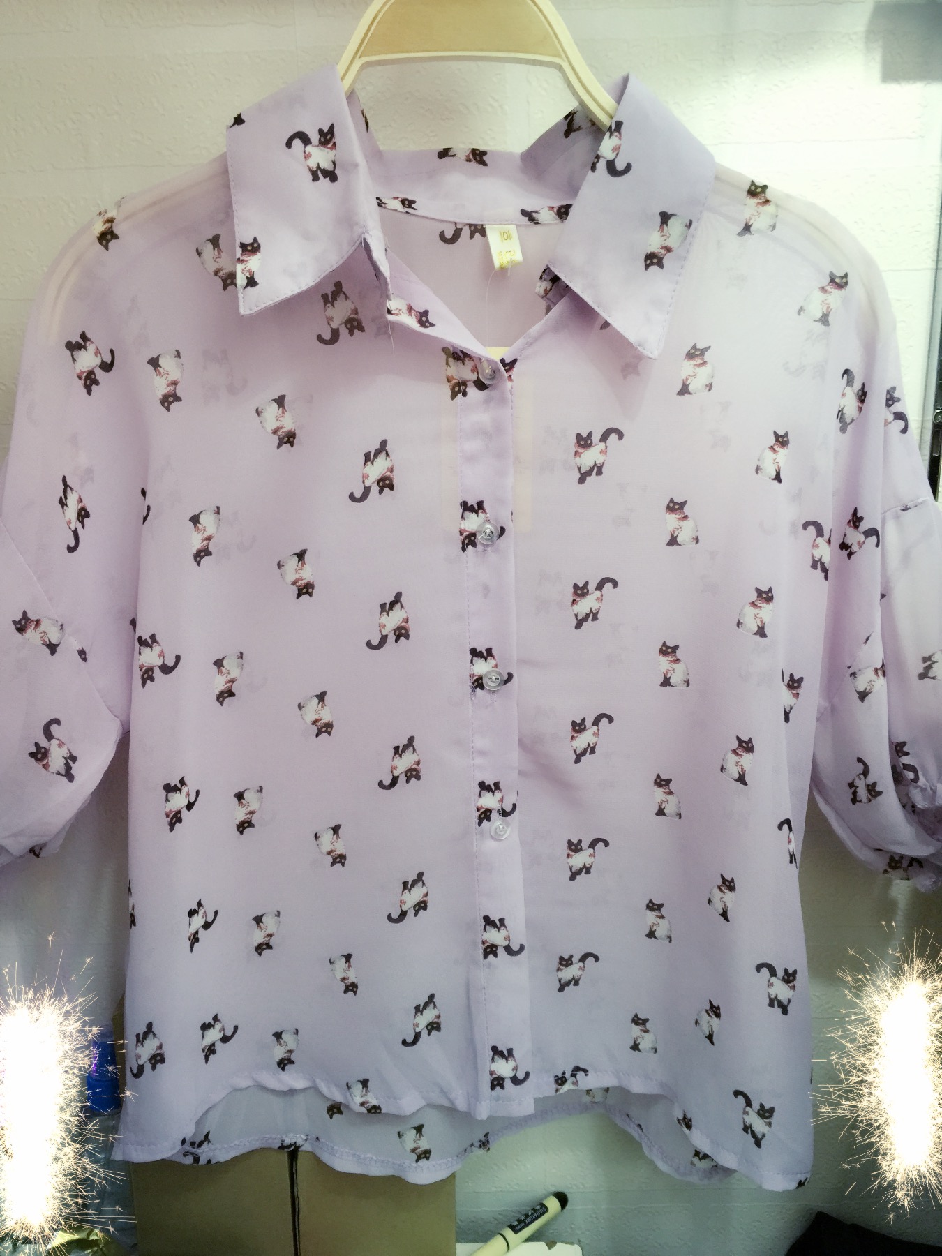 小猫咪图案的淡紫色雪纺衬衫,袖子很漂亮,颜色也很美丽,可以当开衫穿<br>