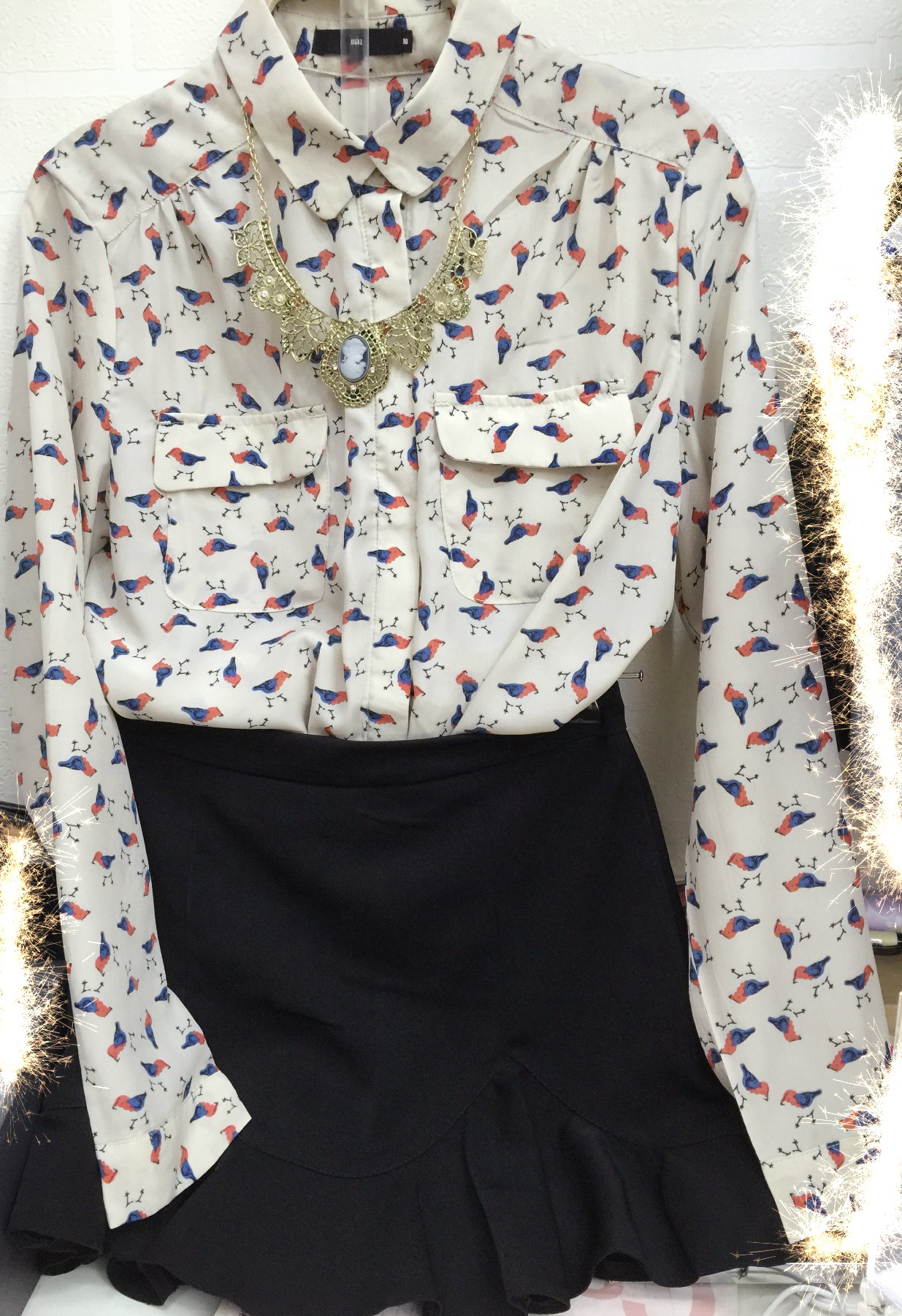 <br> <br> 也是自己搭配的一套,小鸟印花衬衫,滑滑的,衣服M码,裤裙M码,裤子质量很好,外面是裙子,里面是裤子,衣服18,裤子15