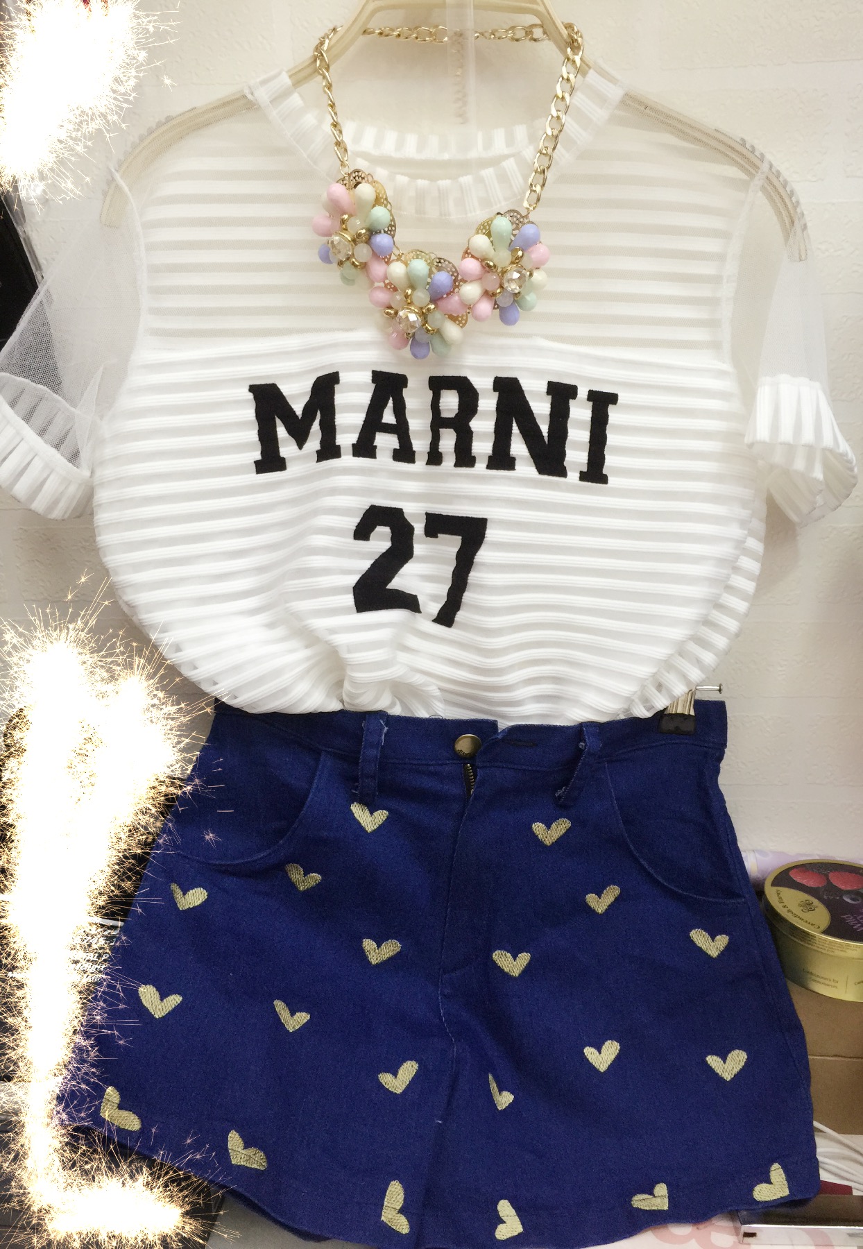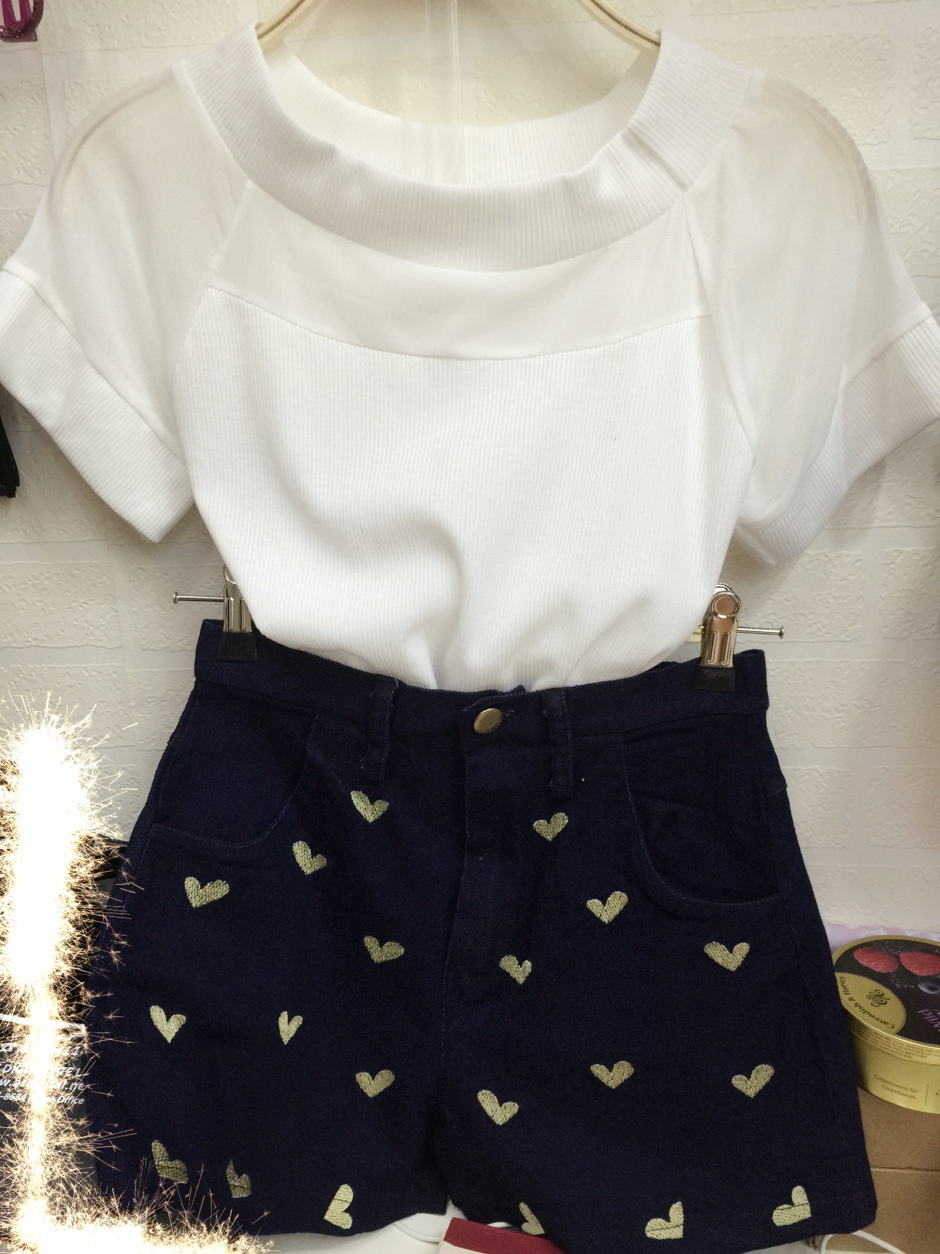 <br> <br> 自己搭配的一套,裤子有两个颜色,心心是刺绣上去的,均码的,我还不知道留哪个颜色比较好,给喜欢的美女挑把,剩下的颜色我自己留,衣服15,裤子15<br>