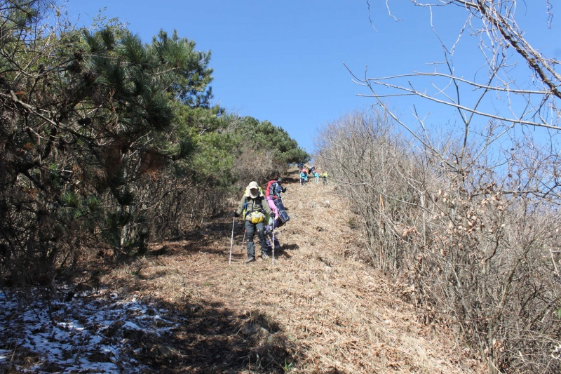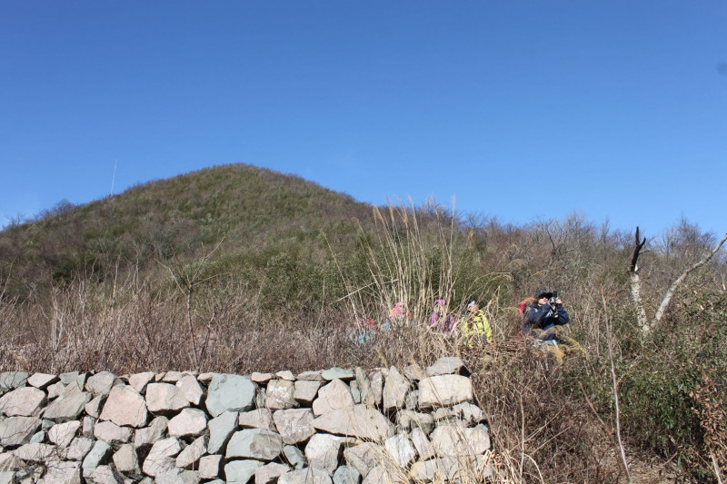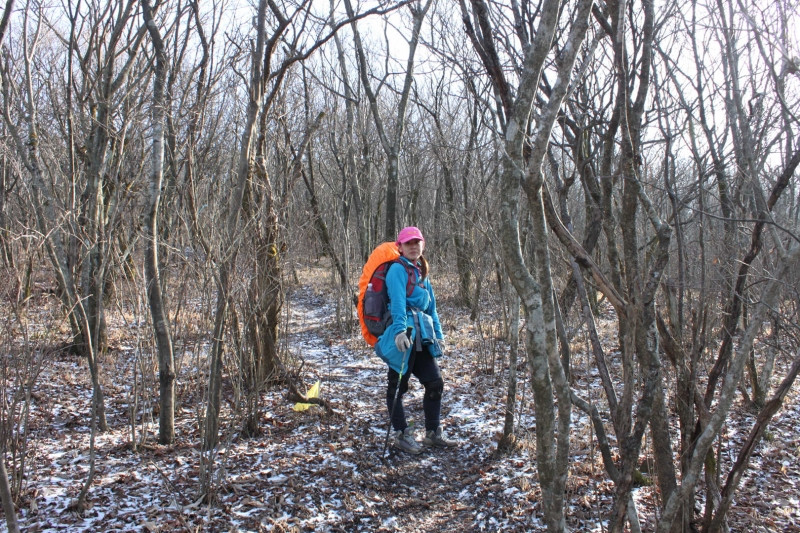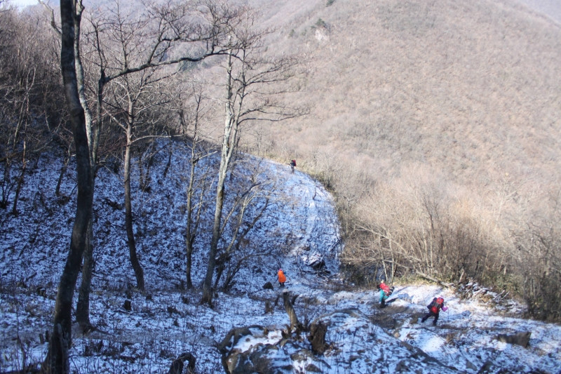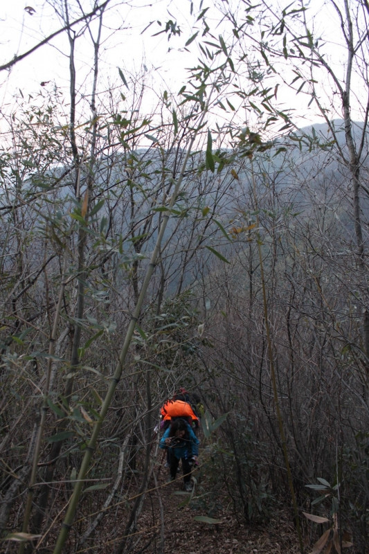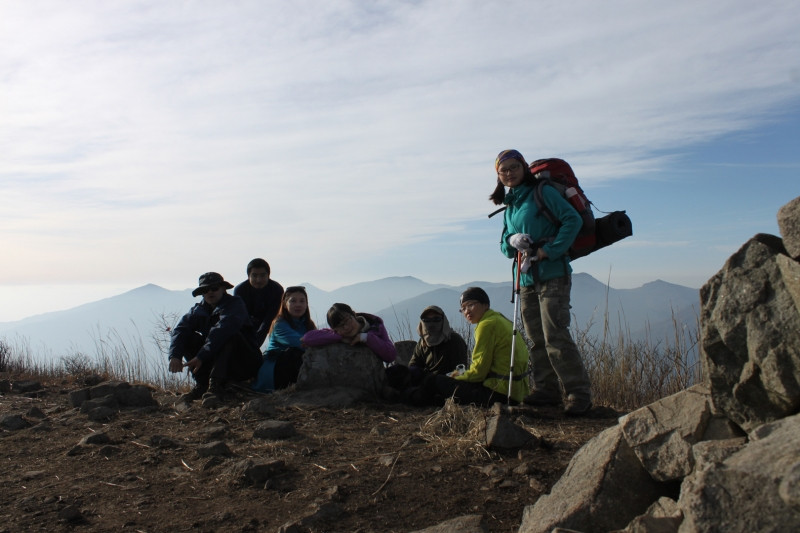 接下来分别登顶了 龙王山和药王峰。中间出现了一个小插曲,有个队友走丢了,是个男生,他走在后面,自己说要慢慢走,不需要我们等,领队由于背了25kg+的东西,累得体力不支,没能及时照顾他。结果我们一路急行军之后,发现他没有跟上来,于是领队带着对讲机和另外一位队友去找,好在找到了,好险。耽误了一小时。