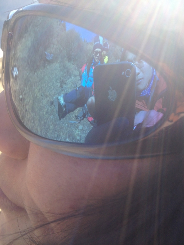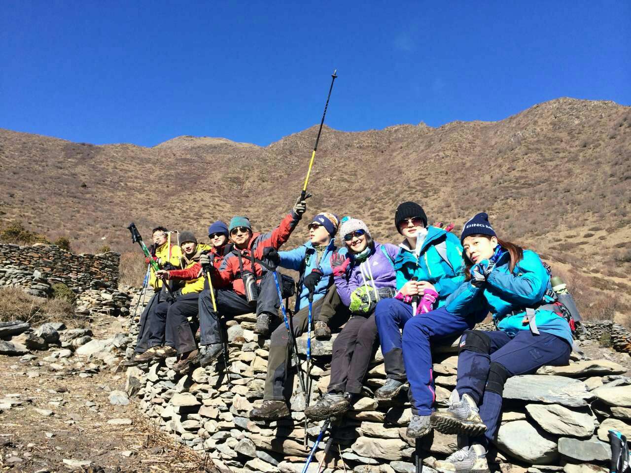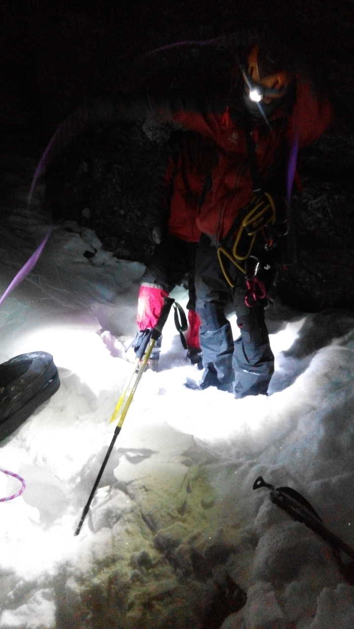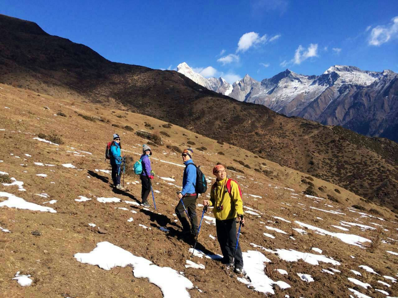 但是,大雪不让路啊,前几天下了雪,挡住了唯一一条很窄的,在悬崖旁边的通往山顶的路。向导和领队试着系上绳子,看看能不能走过二十几米的路,但是最终放弃了,天黑,松雪,很不容易掌握,左侧就是悬崖,一不小心掉下去就呜呼了。。。在这个山头逗留了半小时之后,最终决定下撤。。。啊啊啊,当时那个心情啊,就好像从山峰掉到谷底。