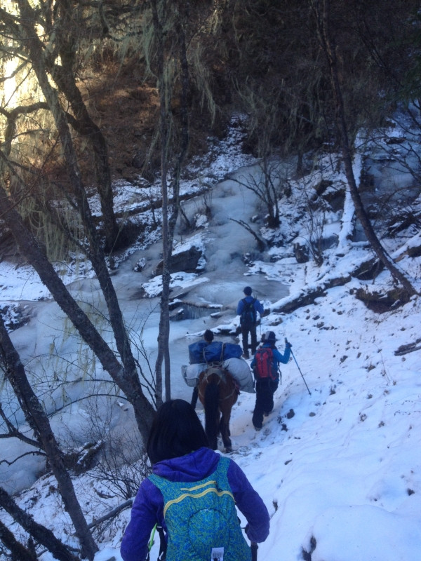 Day 3:早上10点出发(因为要办进山证之类的,等工作人员上班,签好军令状,就十点多了),请了三个向导+协作,行李由马背。我们都是轻装上阵,背个小包,内装水和吃的。