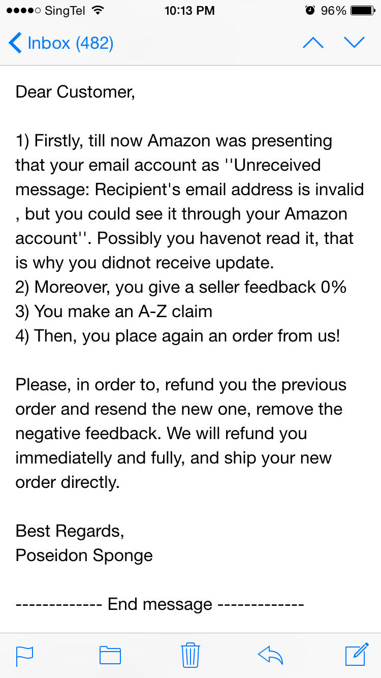 换了国内怕是雇人对你电话骚扰了。如果你是那个卖家,从联系不上的人那里得一个差评,写这样一份电邮似乎没有什么不妥。