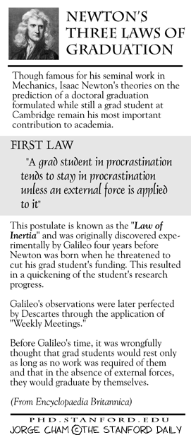 (v) 对于数学系的人来说,由于不需要像别的专业一样做实验,所以时间非常自由,除了干一些教学工作,剩下的时间都是自由安排。这种自由职业者如果时间安排不当,很容易产生拖延症,陷入PHD的时间陷阱而不能自拔。对于搞纯数学的PHD来说,一个PHD的课题绝对不是在几个月之内就可以完成的,一定会有一段时间没有任何的进展和突破。这个时候由于要克服自己的心理压力,很容易在自己的科研课题上面产生拖延症,好比牛顿第一定理,在没有外力的催动下,自己的课题一定会停滞不前,能毕业日期也就离自己越来越遥远。如果出现这种问题,需要及时克服自己的心理障碍,战胜拖延,免得造成更大的困扰。