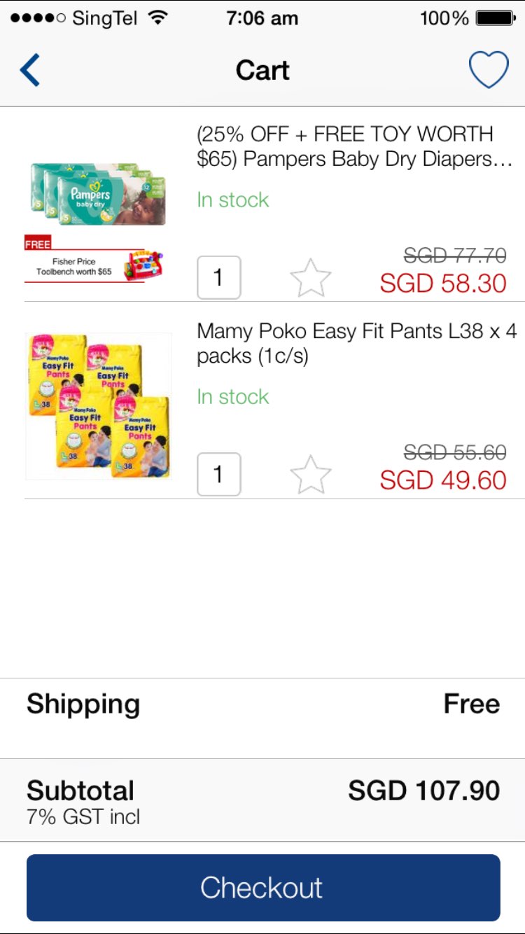 我在red mart 买了pamper 的尿不湿新人第一个order 减10块,最后付了66 sgd