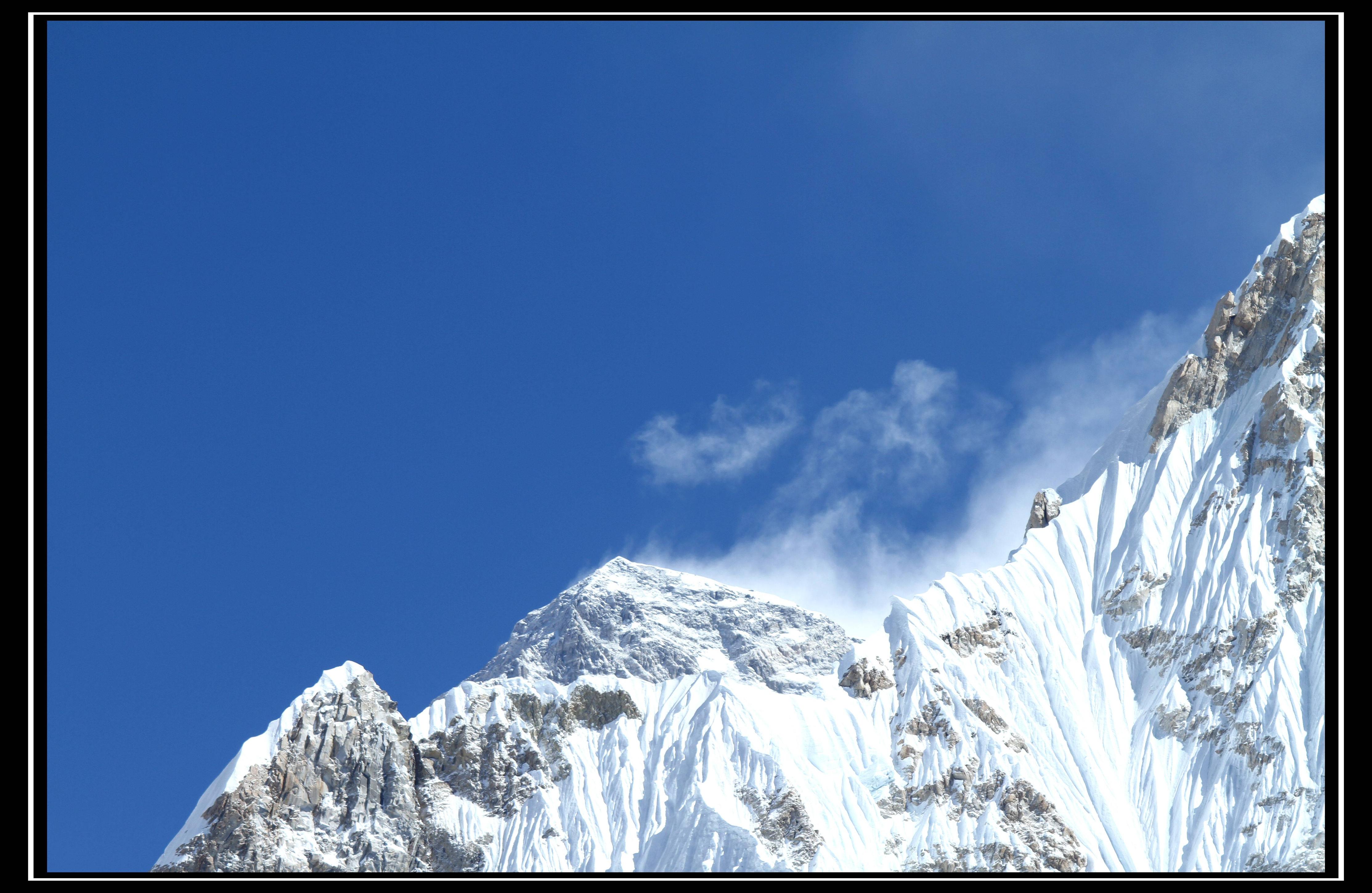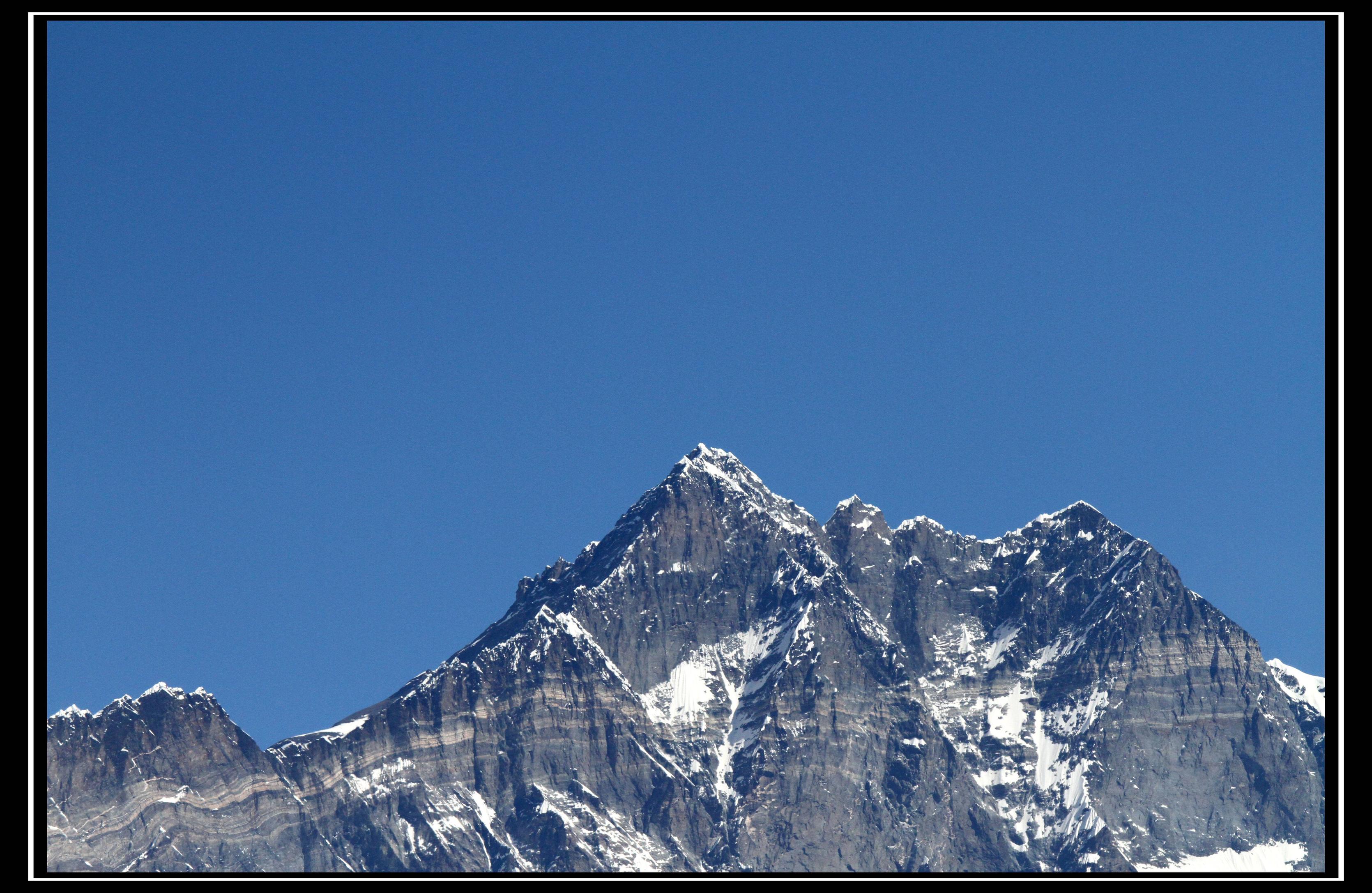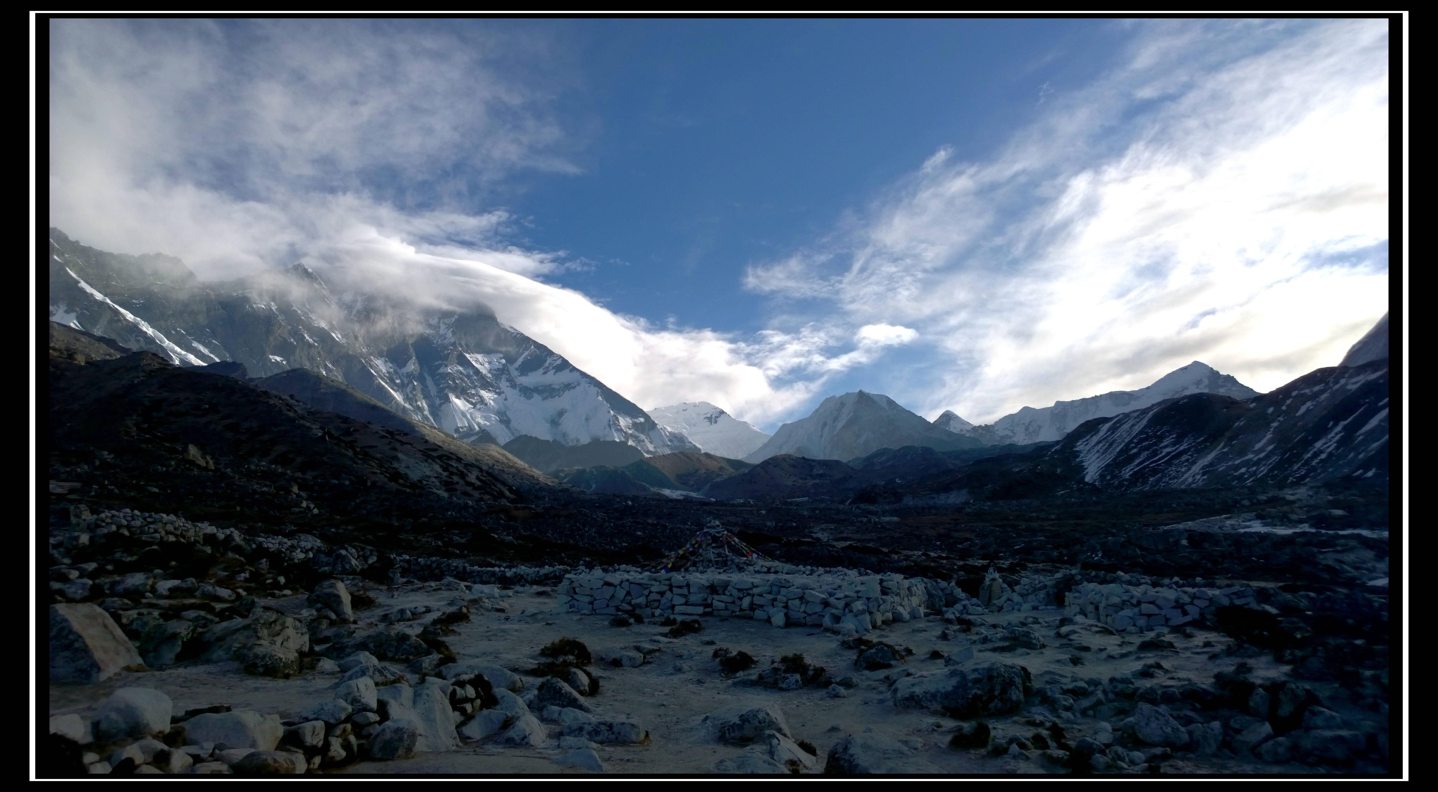 珠峰与洛子峰从这个角度已经一览无余了。天气晴朗,珠峰上早早地就扬起了旗云。洛子峰脖子上一道道的沉积岩层理也有趣,就像是它的围脖。