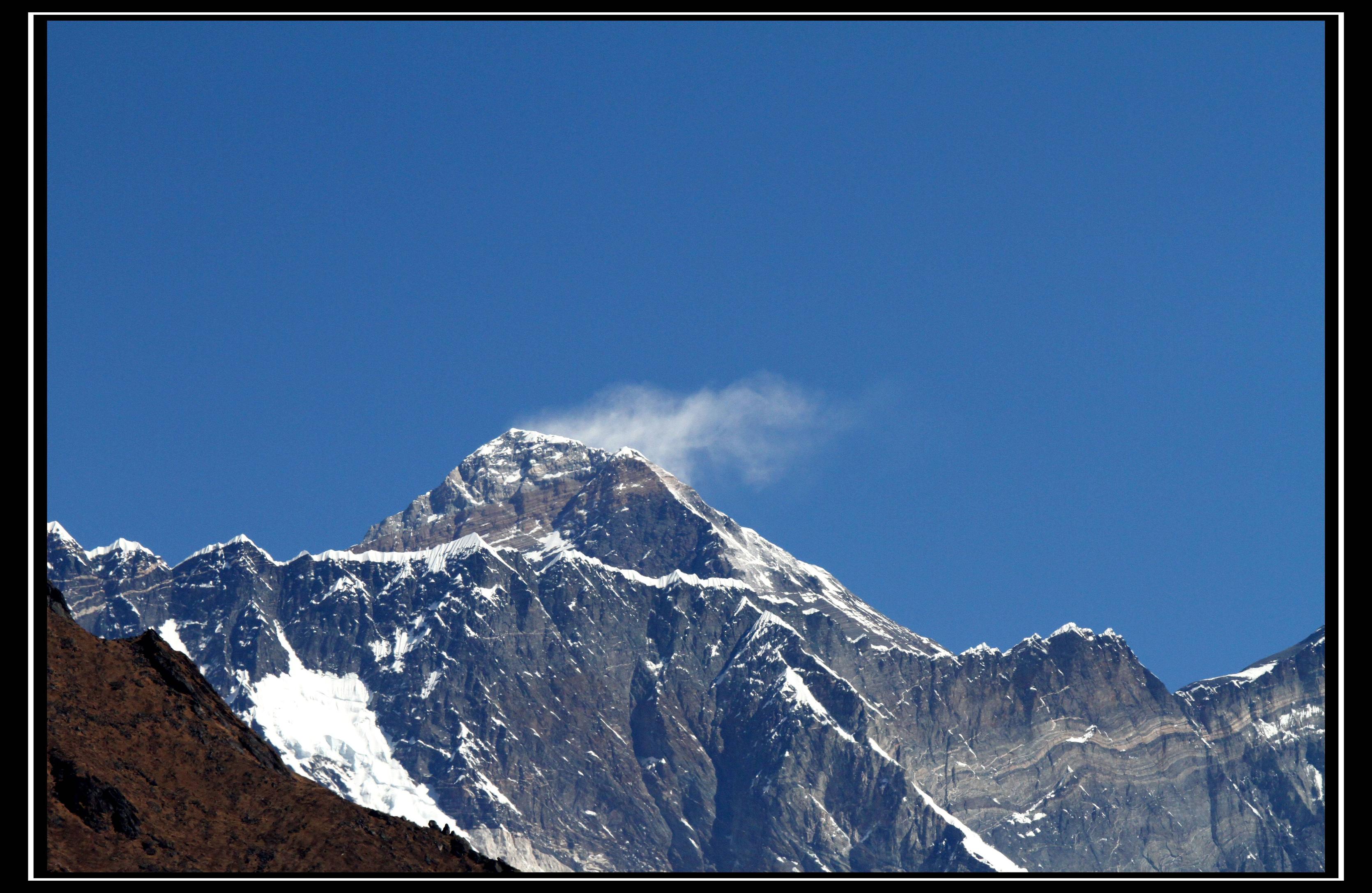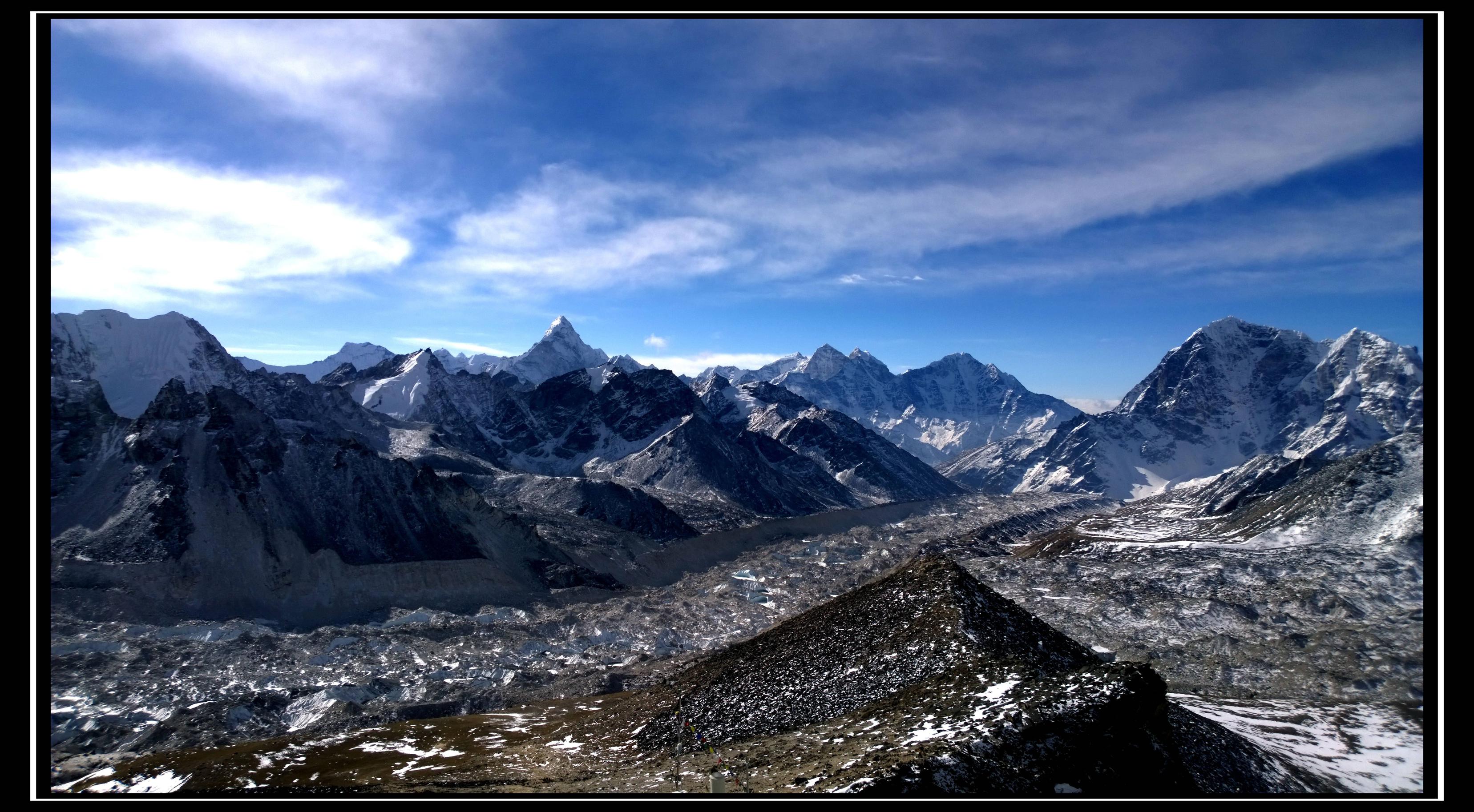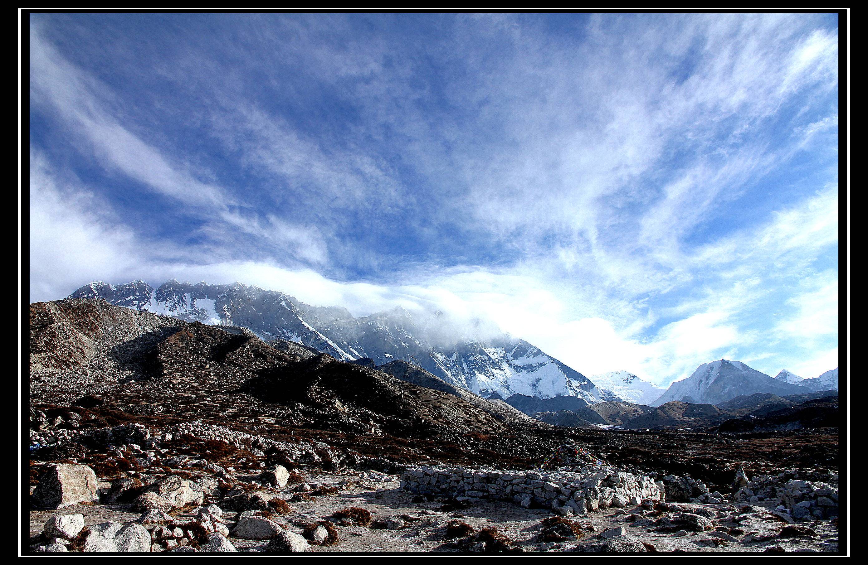 珠峰与洛子峰从这个角度已经一览无余了。天气晴朗,珠峰上早早地就扬起了旗云。洛子峰脖子上一道道的沉积岩层理也有趣,就像是它的围脖。