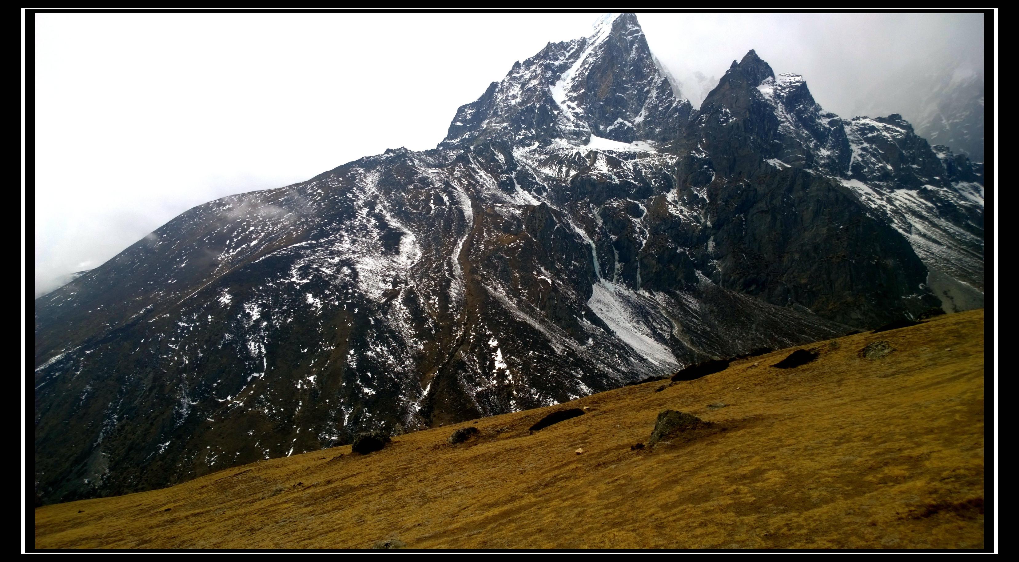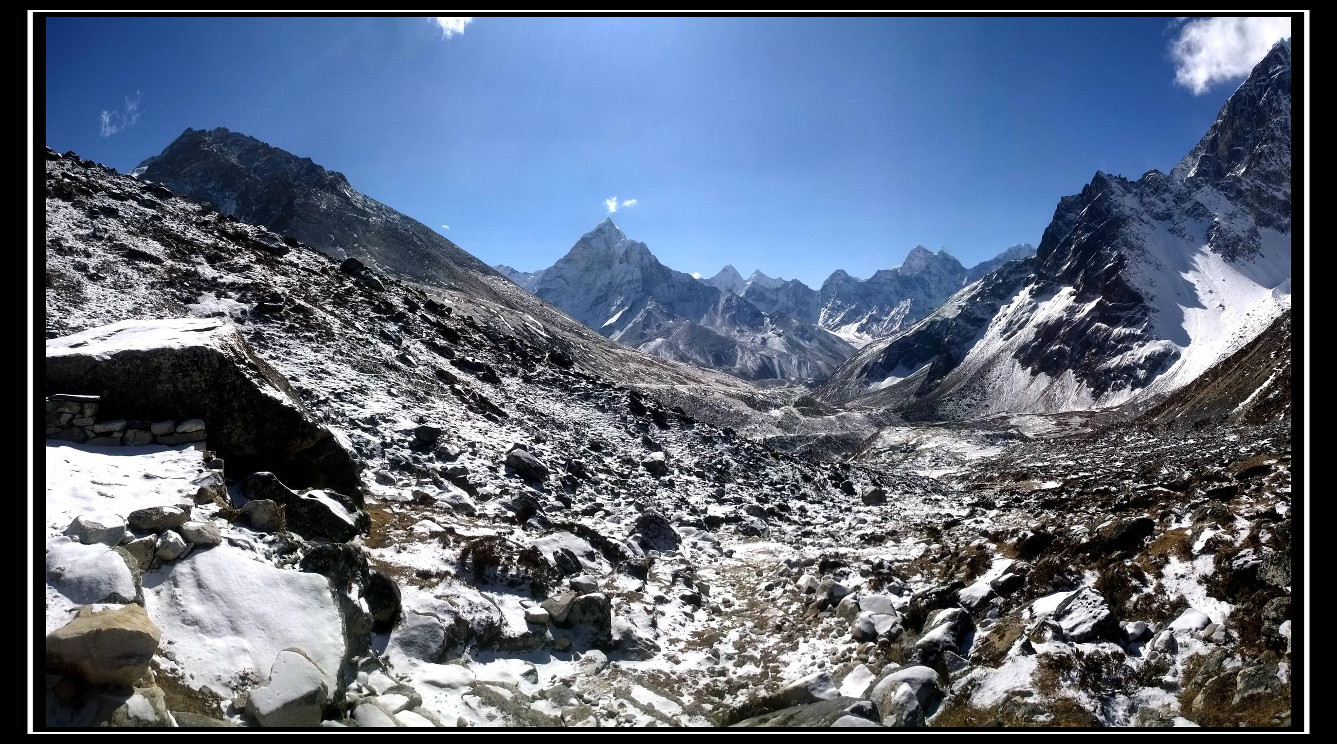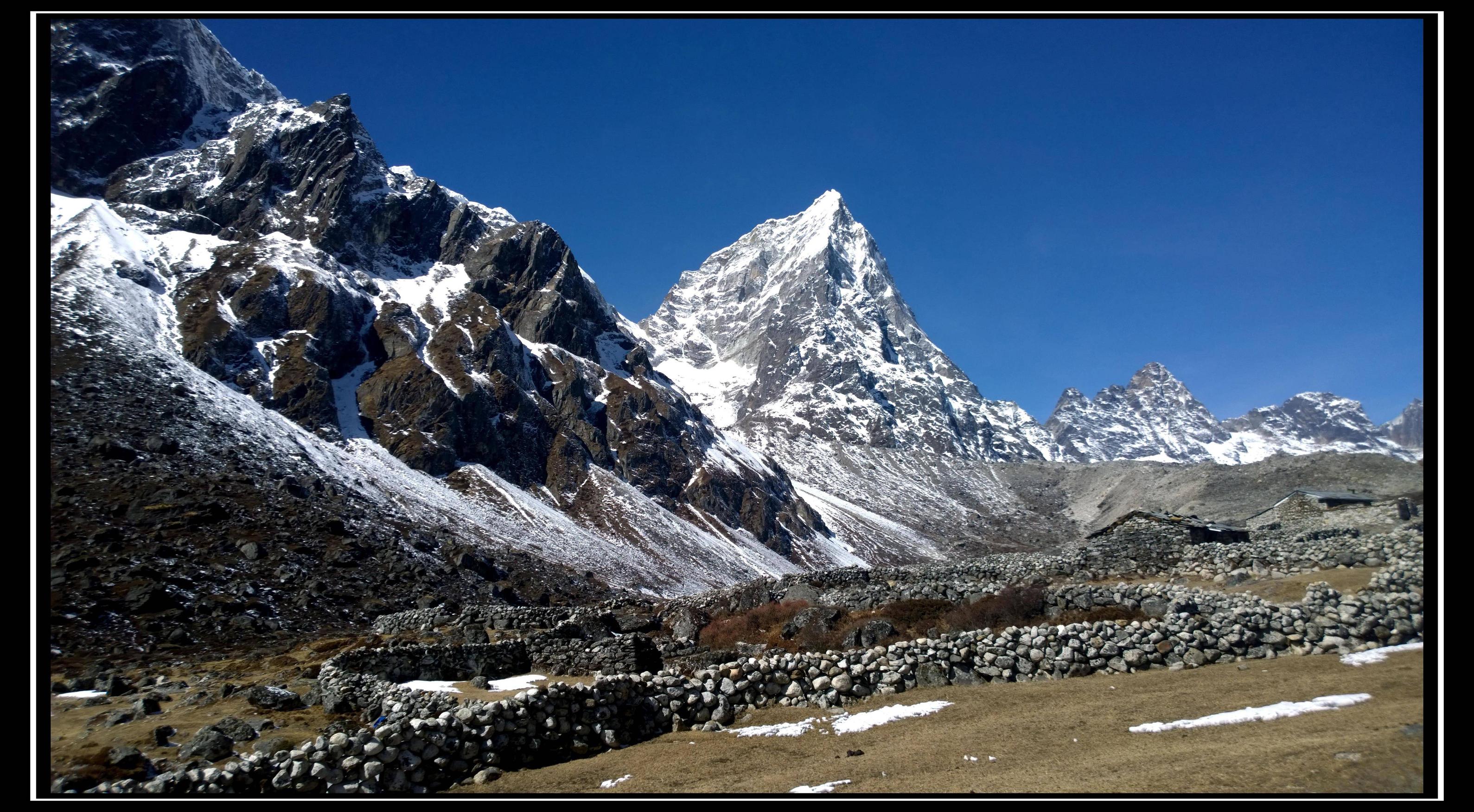 回到Dingboche,用完早餐继续上路。Periche位于峡谷底,而我们走的是绕山腰过去的那条路。一路都是与对面的雪山隔着峡谷相望。