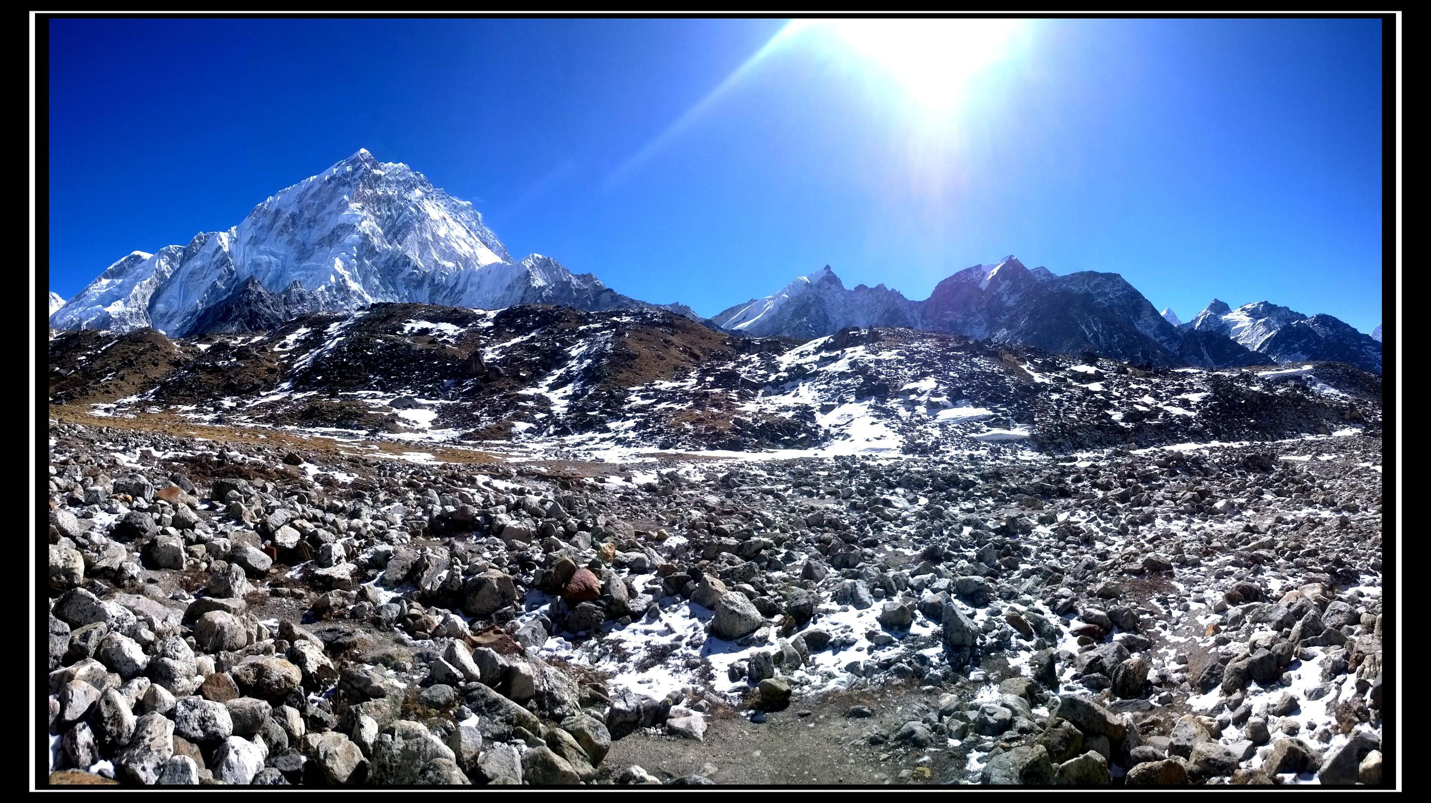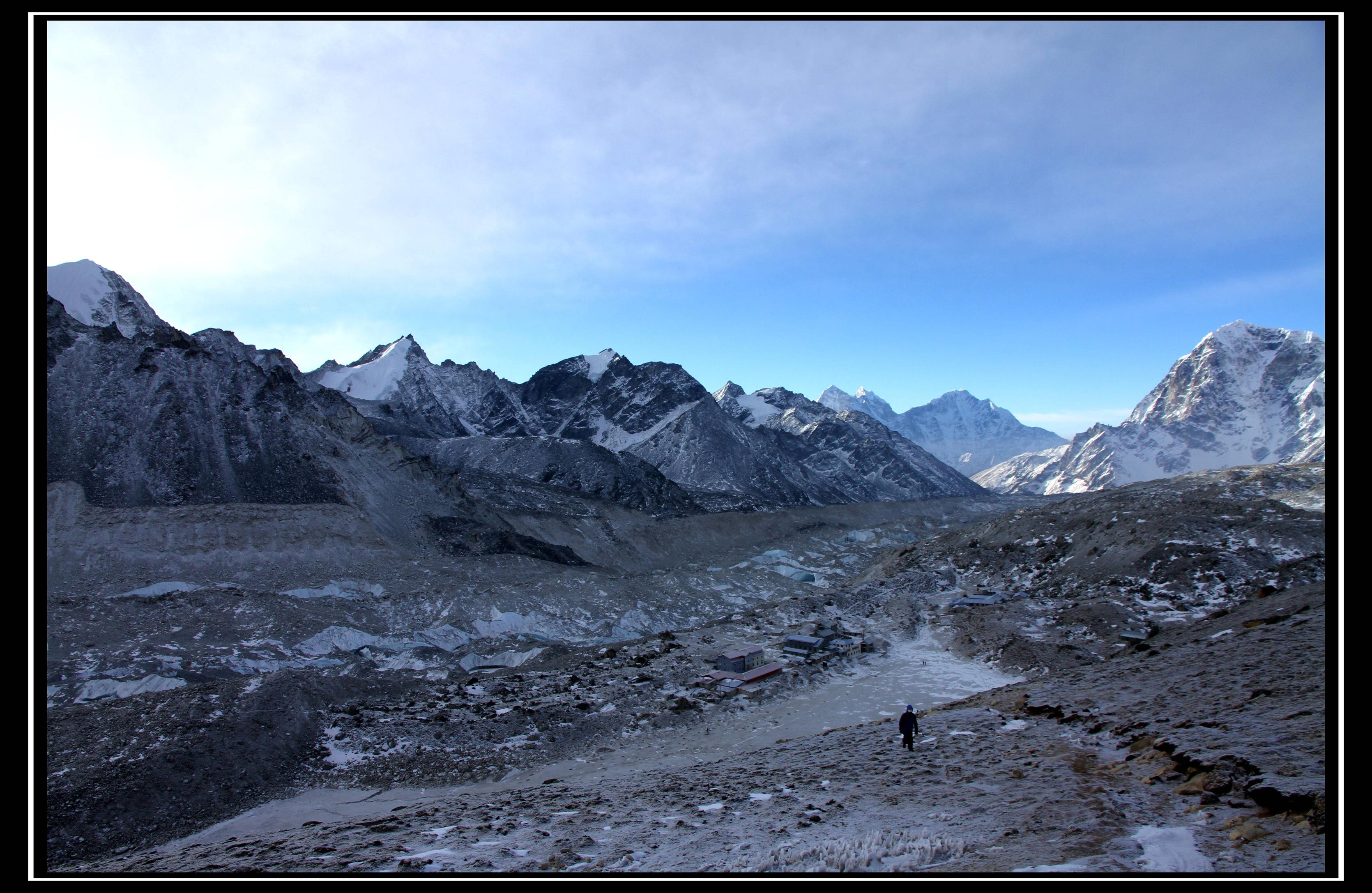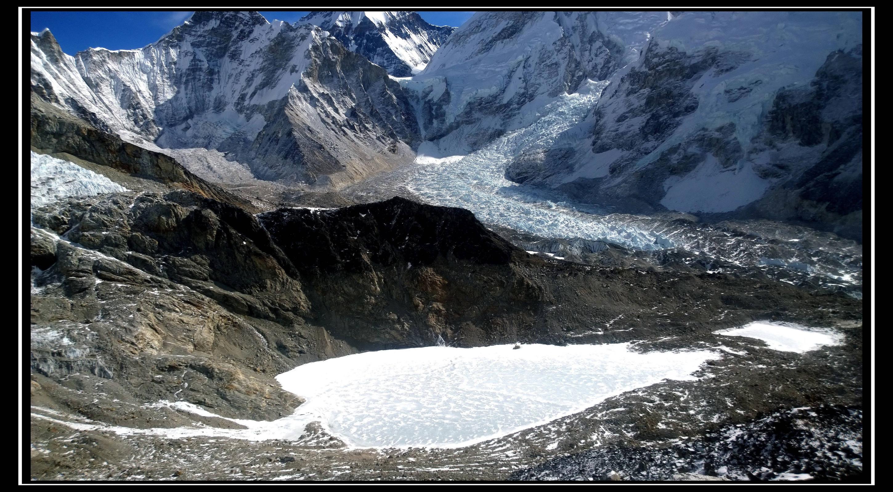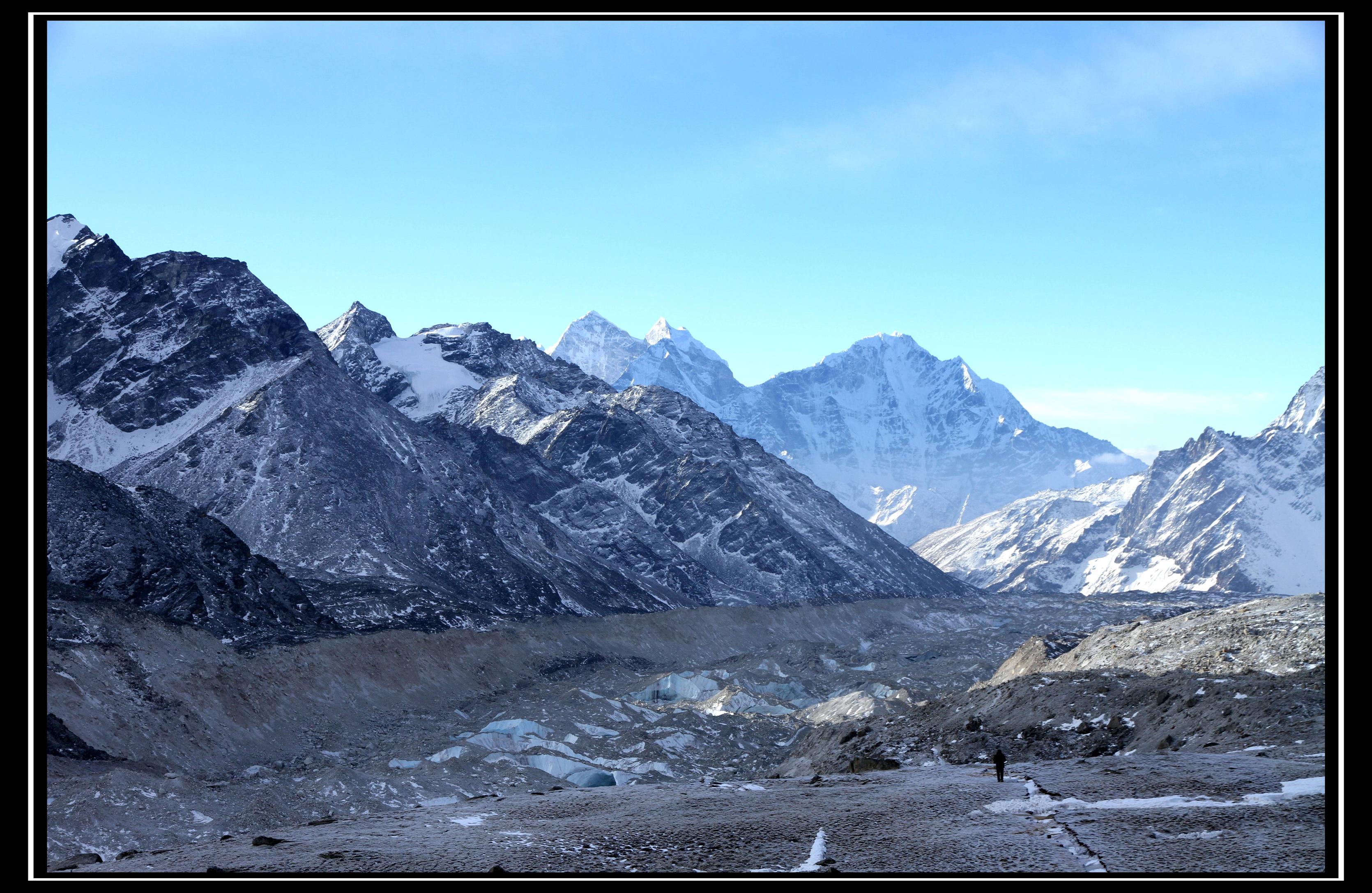 从Gorek Shep去往EBC,一路跟昆布冰川平行着走。这个五千米上的冰川的神奇之处,是被一层岩石覆盖在下面,至于是怎么造成的,令人费解。