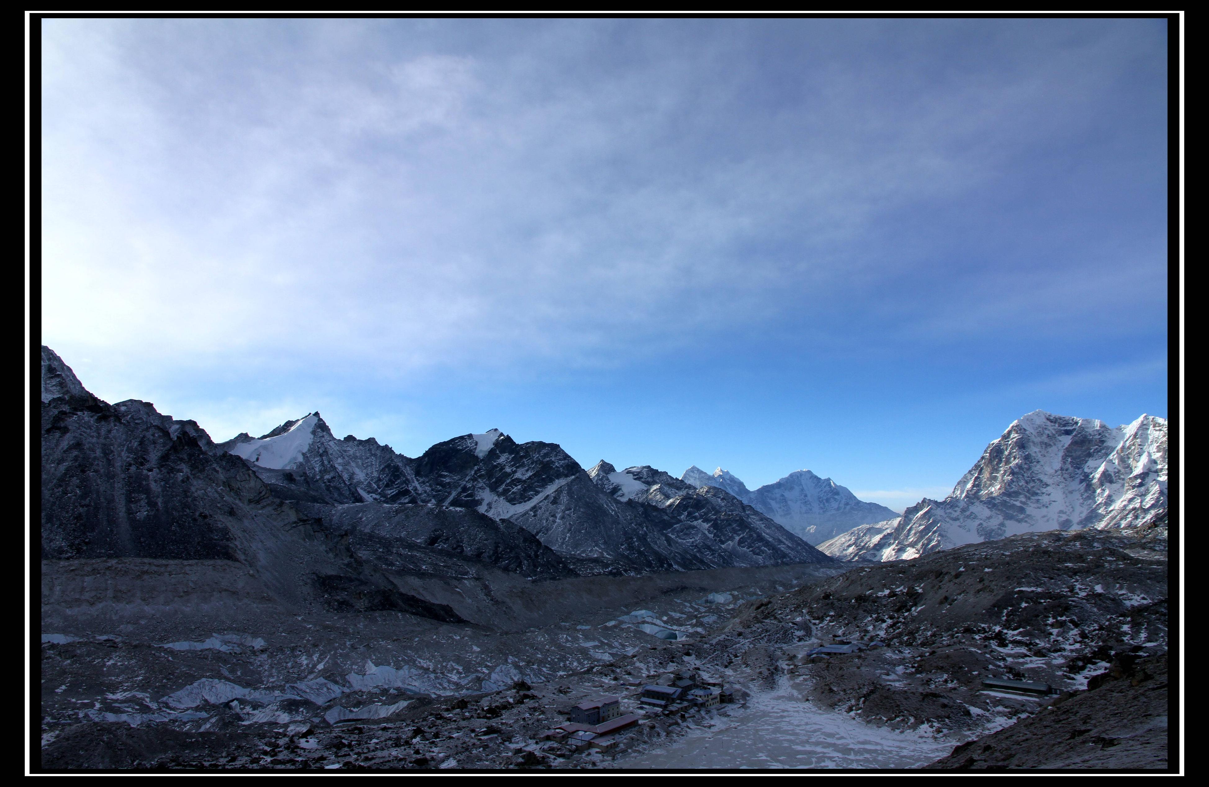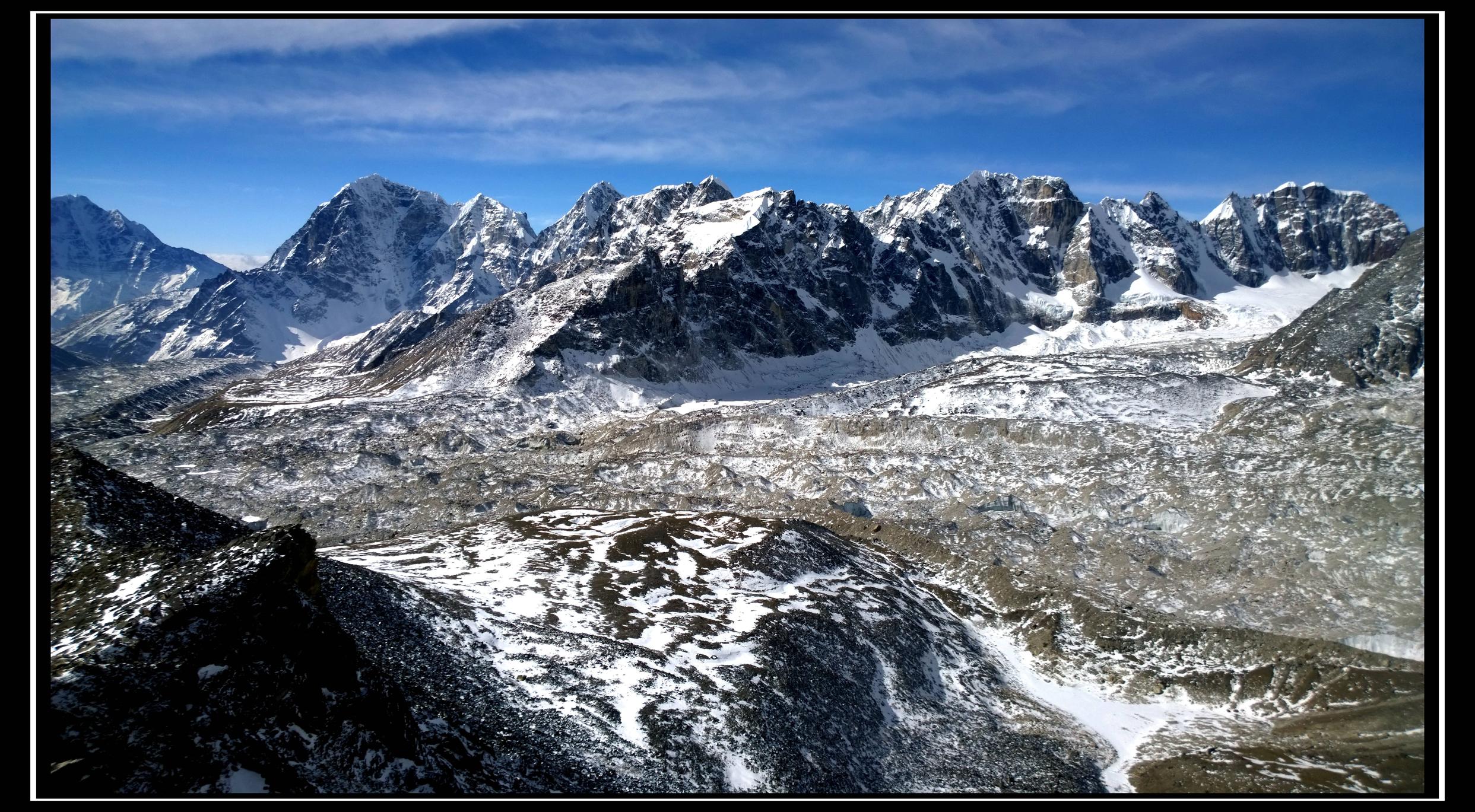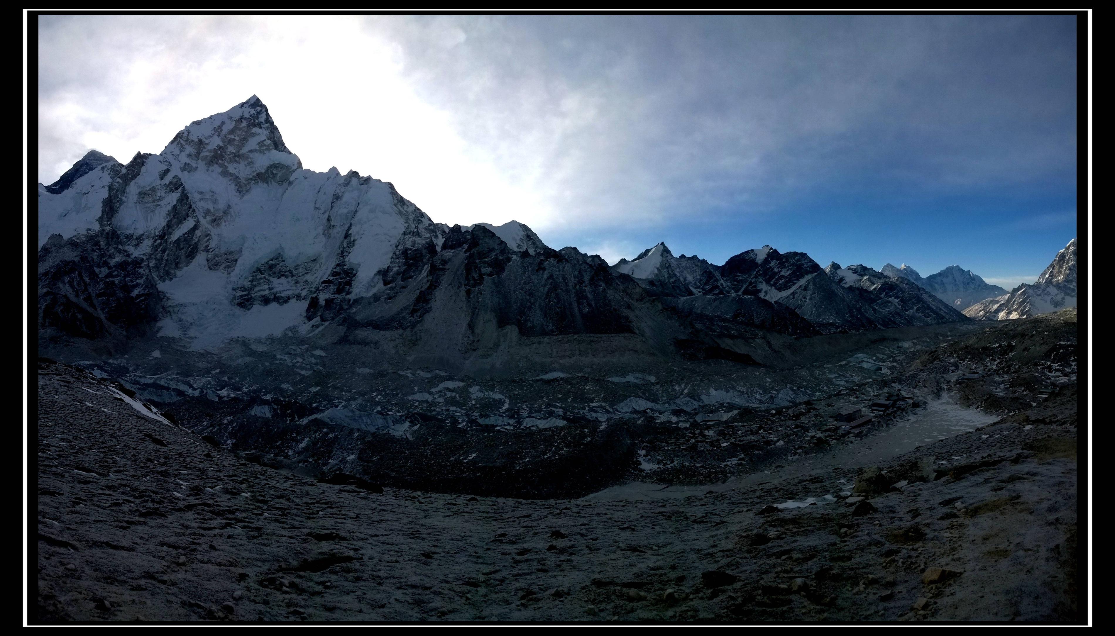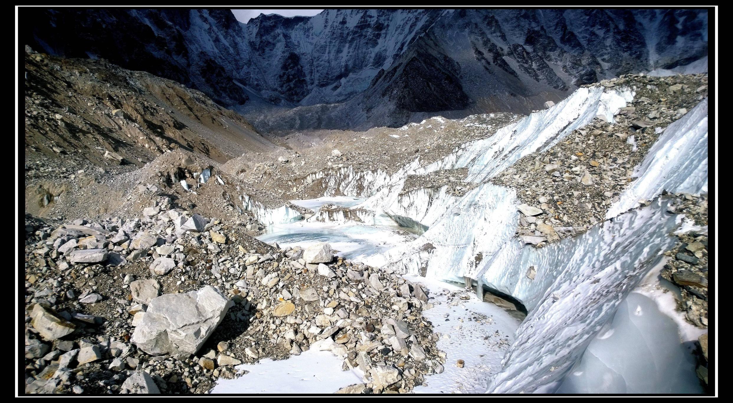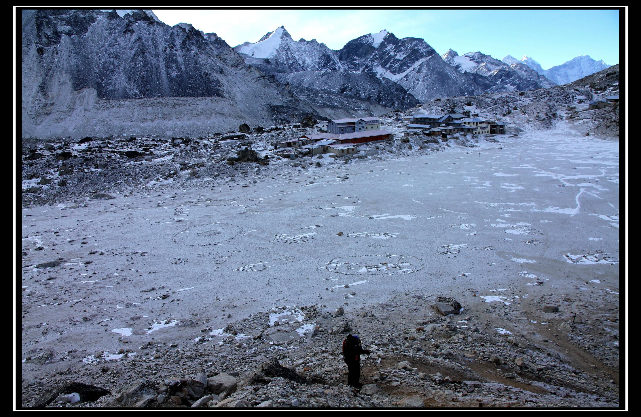 从Gorek Shep去往EBC,一路跟昆布冰川平行着走。这个五千米上的冰川的神奇之处,是被一层岩石覆盖在下面,至于是怎么造成的,令人费解。