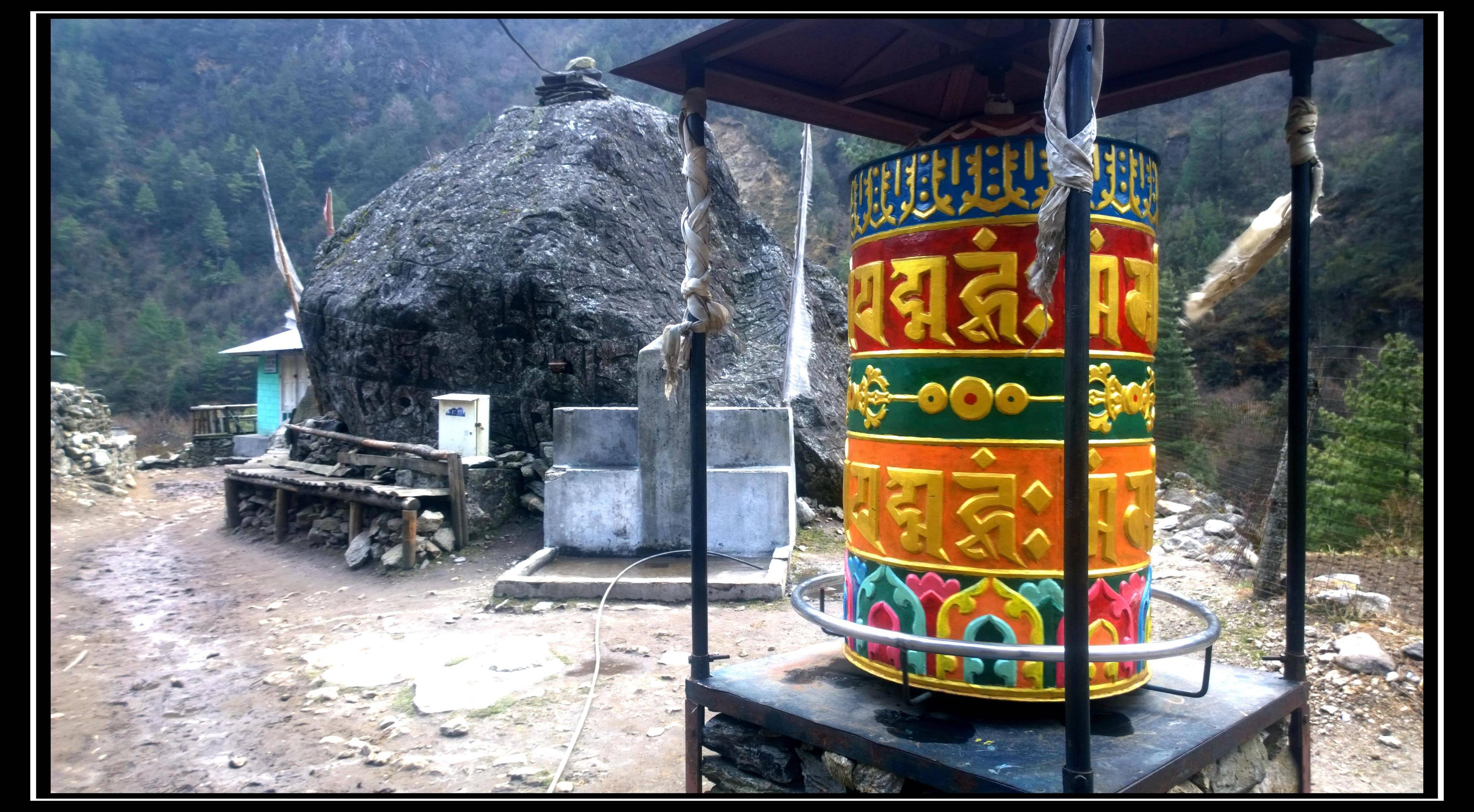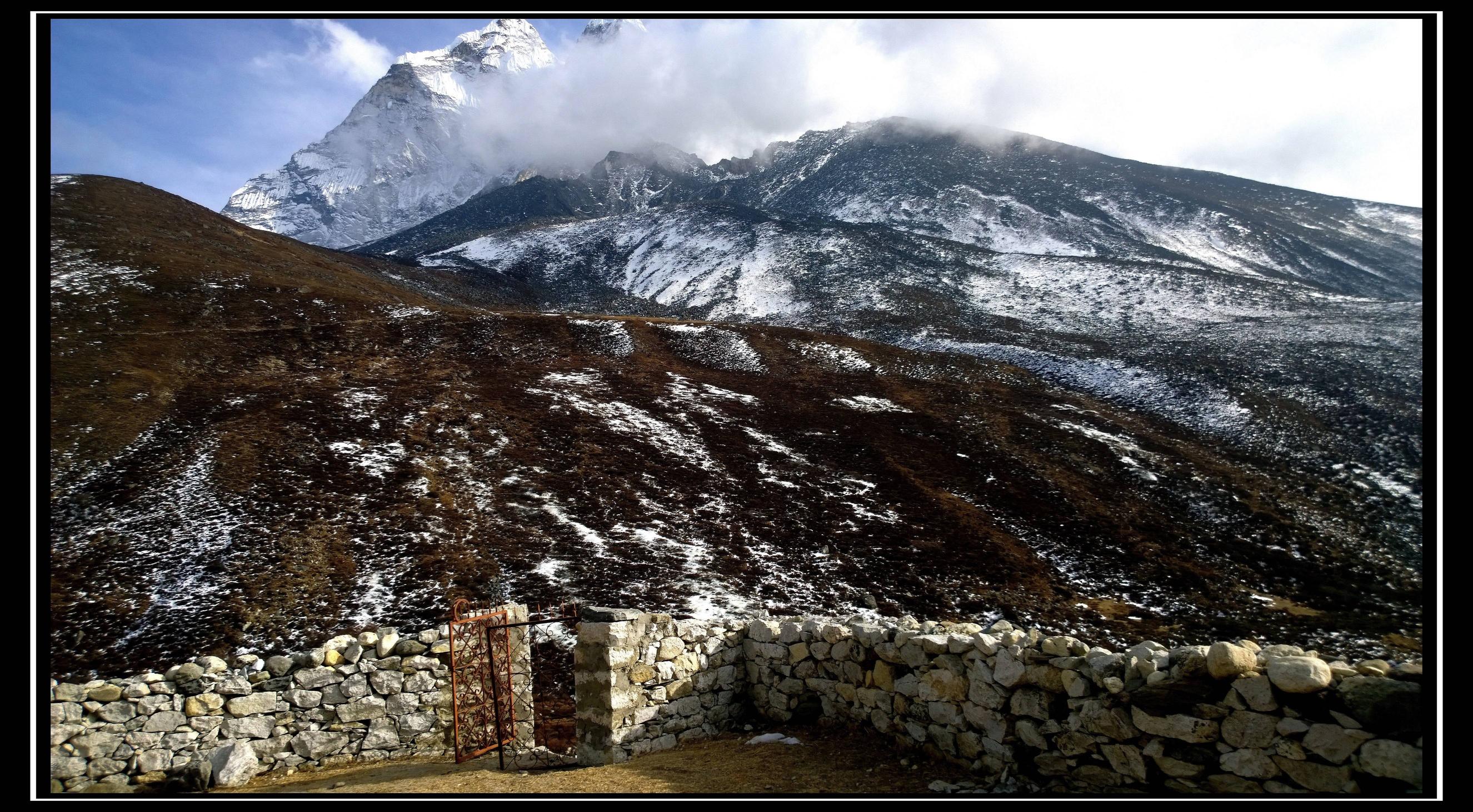 到了Dingoche,感觉就在Ama Dablam的山脚。旅馆有个用石头圈起来的小后院,那扇铁门打开着,仿佛从那个门出去,你就进入了Ama Dablam的神奇世界。你好奇地走了过去。