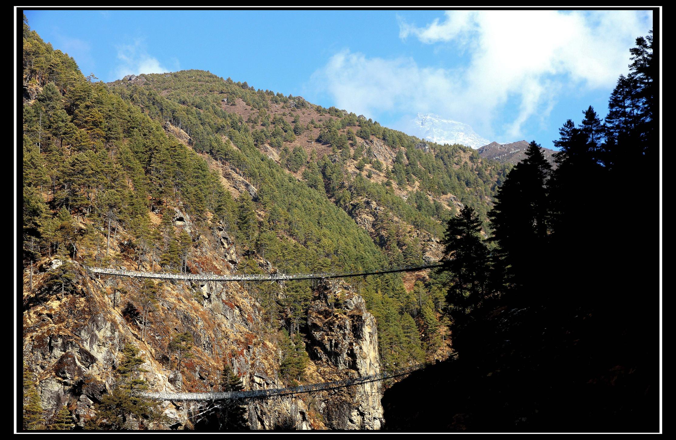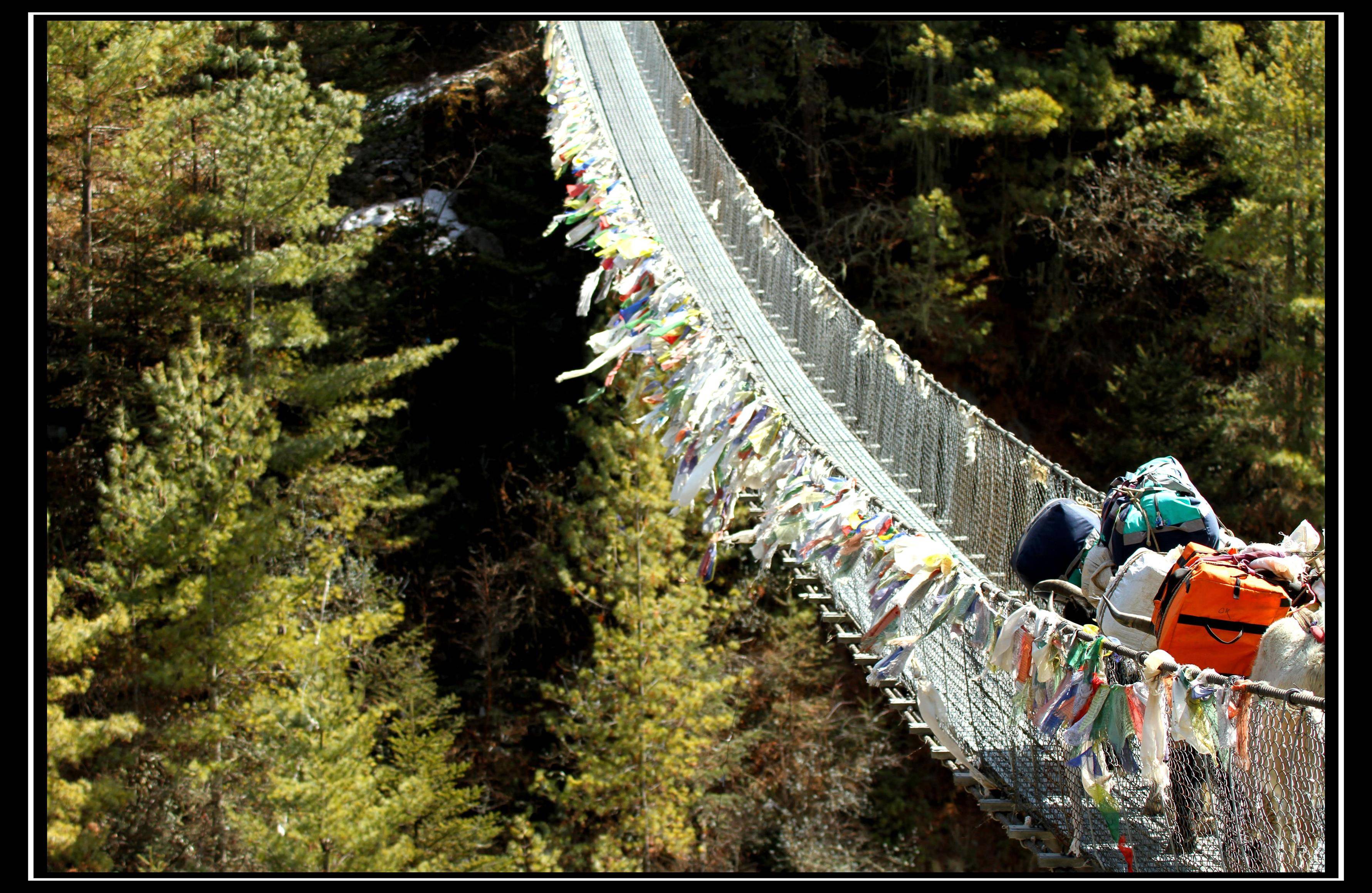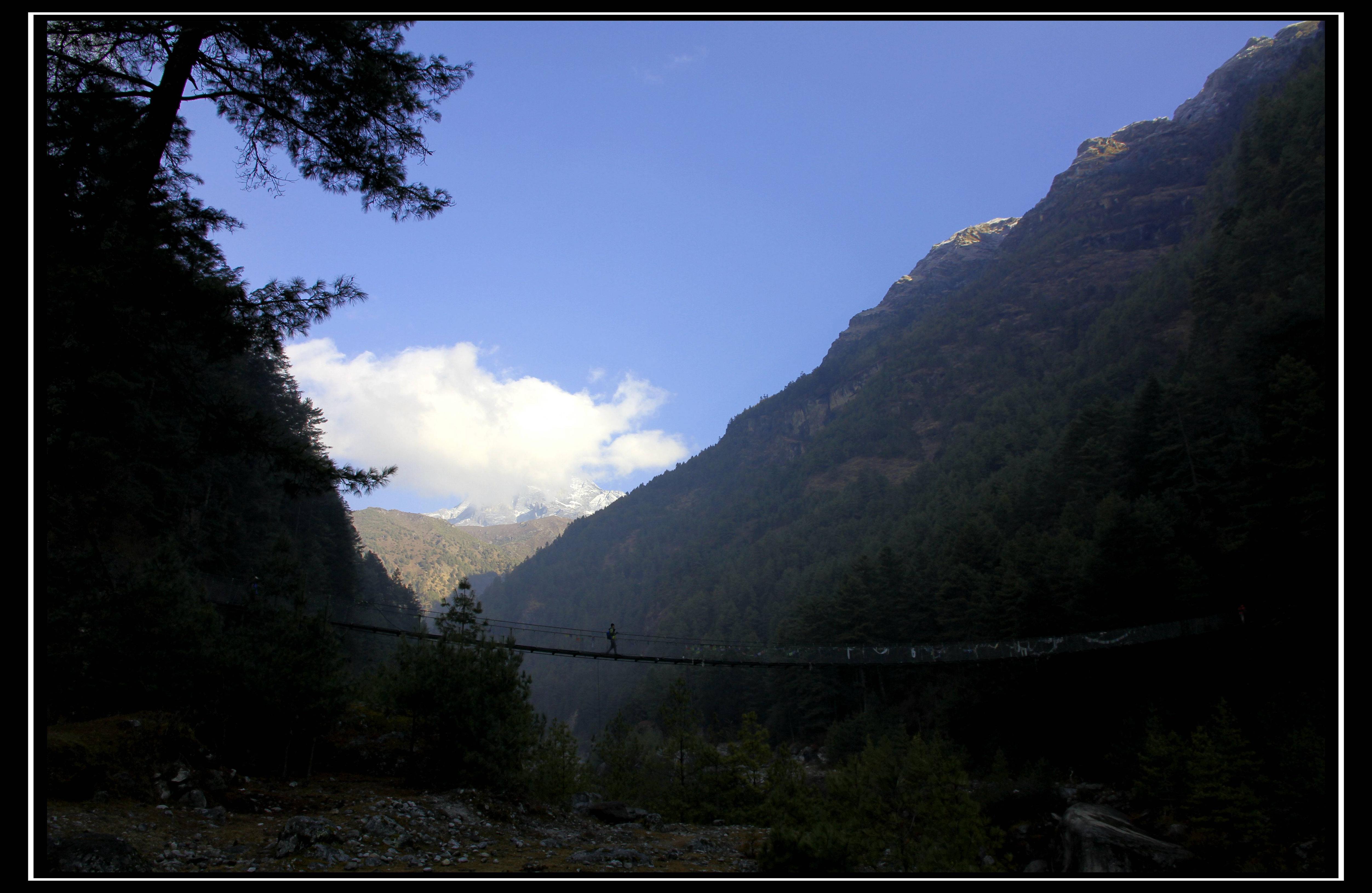 这是过的第一座长长的铁丝桥,EBC一路上要过十来座这样子的长桥,铺上竹片或者铁条,摇摇缓缓地走过去,从河的这边到那边,颇有一番滋味。