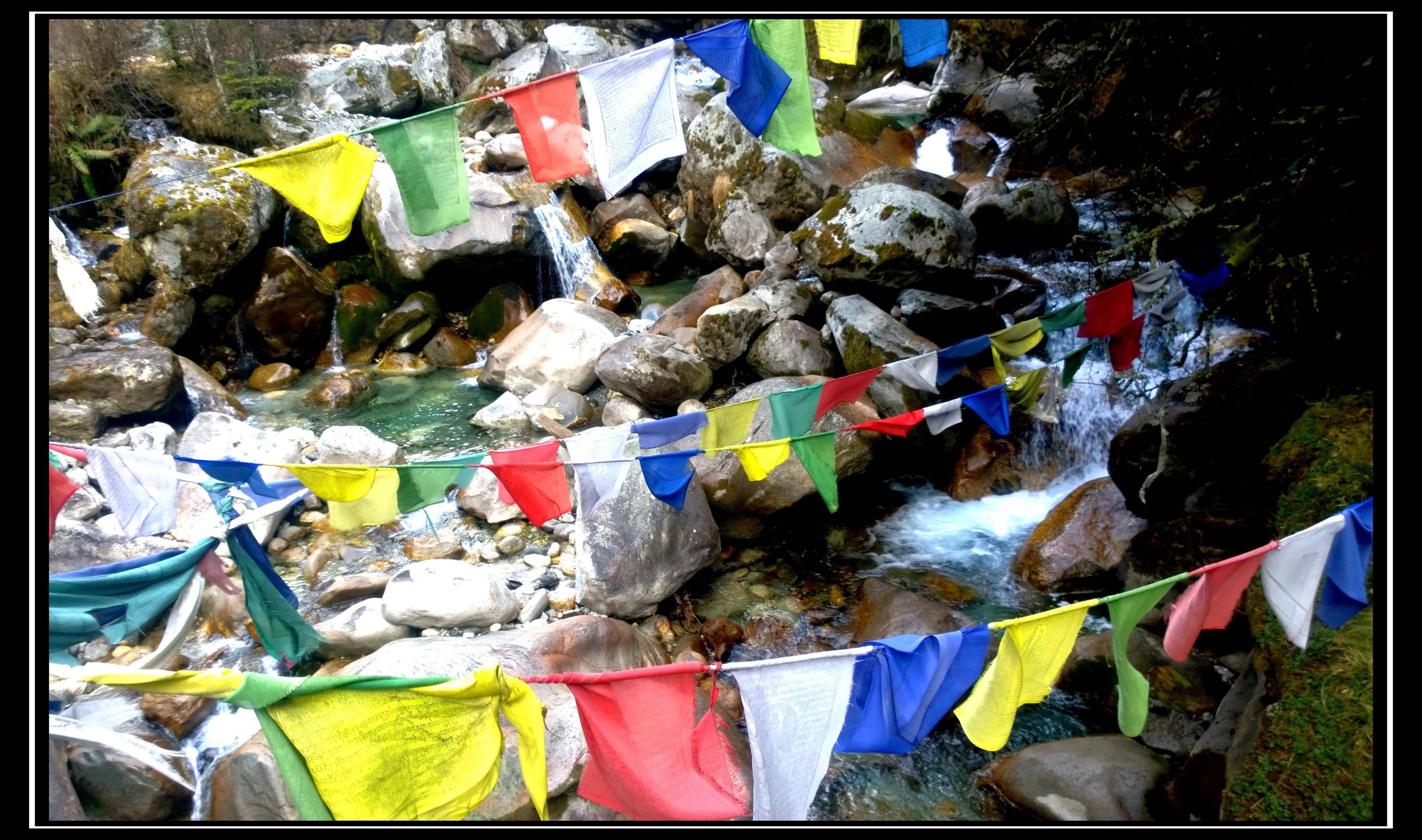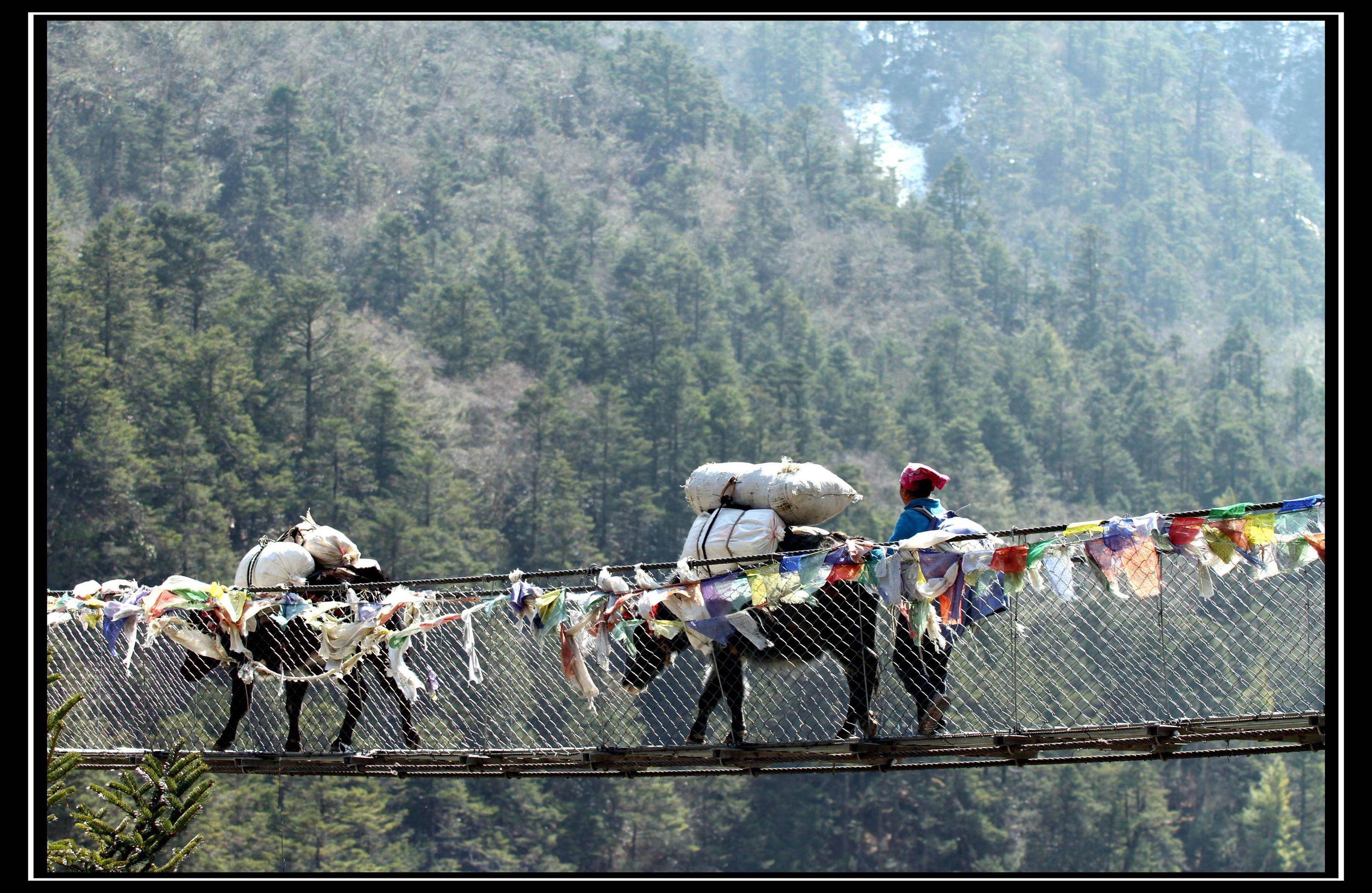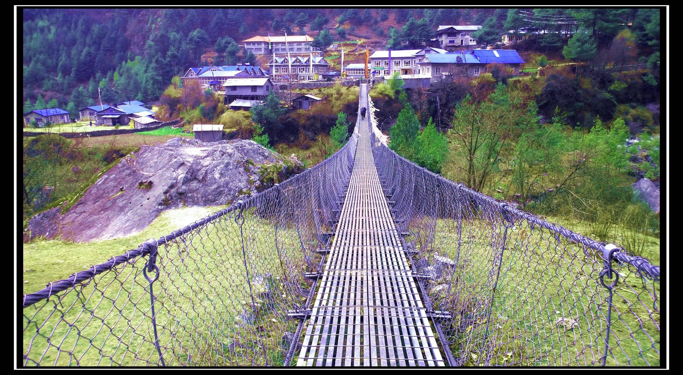 这是过的第一座长长的铁丝桥,EBC一路上要过十来座这样子的长桥,铺上竹片或者铁条,摇摇缓缓地走过去,从河的这边到那边,颇有一番滋味。