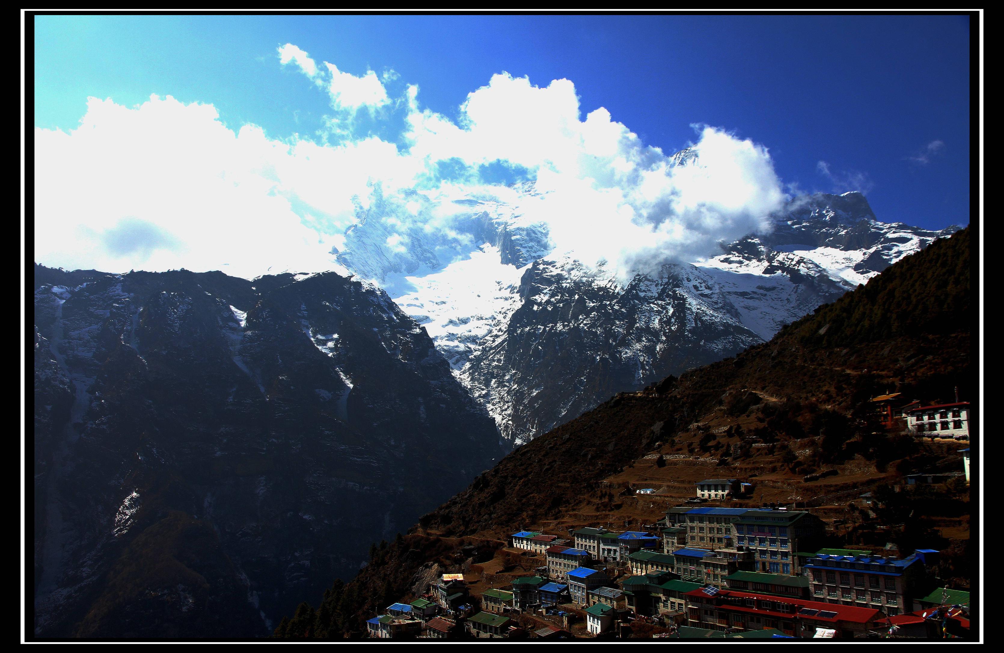 到了下午,Kong De峰上便云雾缭绕了。南池市场的红绿蓝色的房子,跟雪山相映成趣。