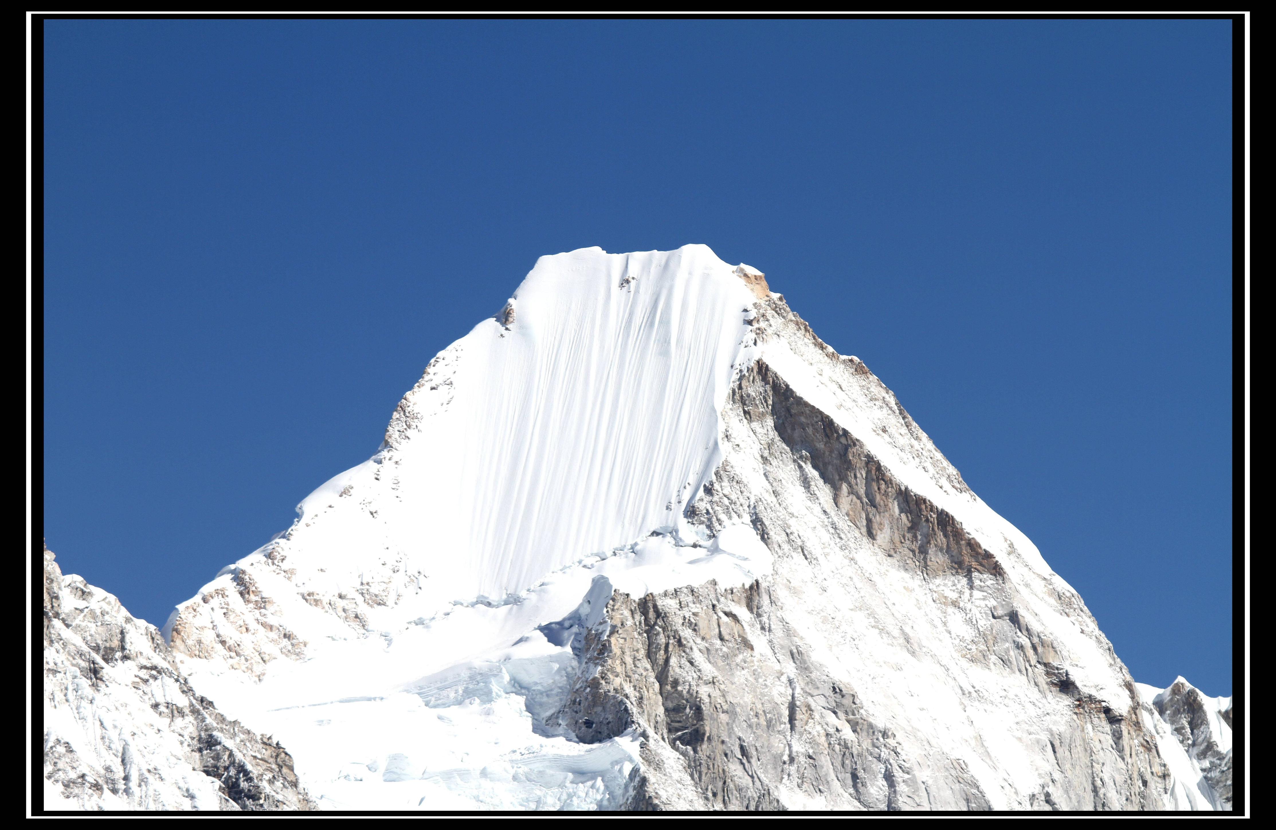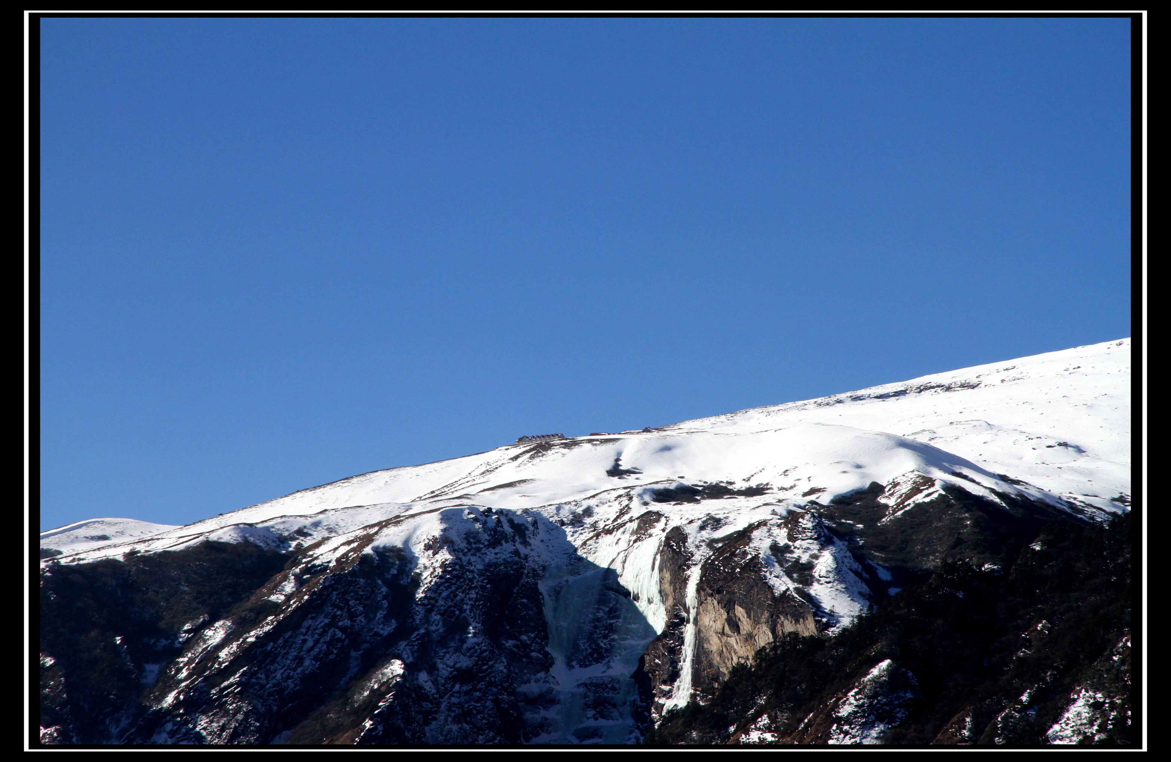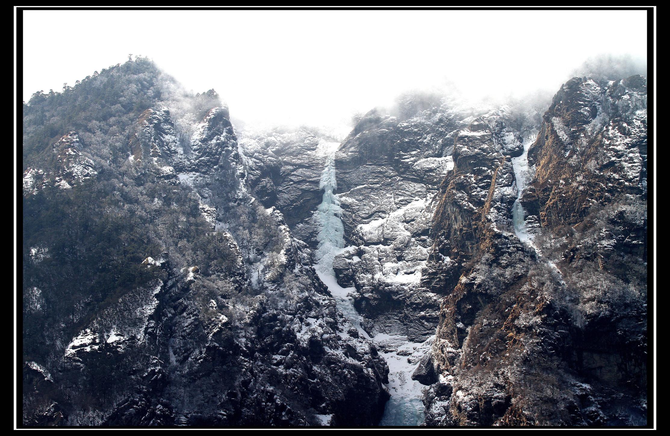 将到南池的时候,Kong De峰便突兀地横亘在面前。一条条的冰川悬挂在山沟里,白中泛蓝,似乎还在流淌着,再定睛一看,是静止的瀑布。