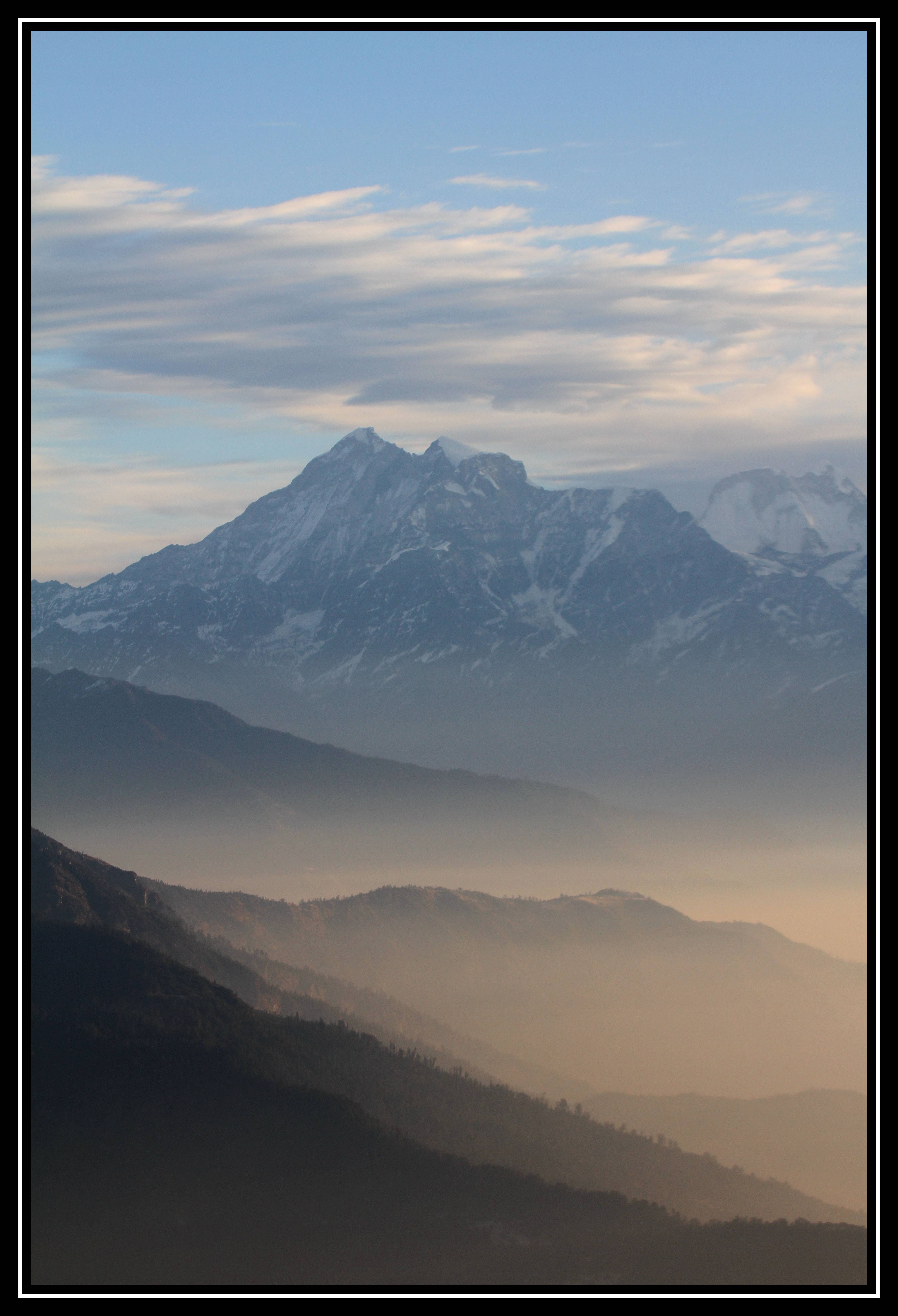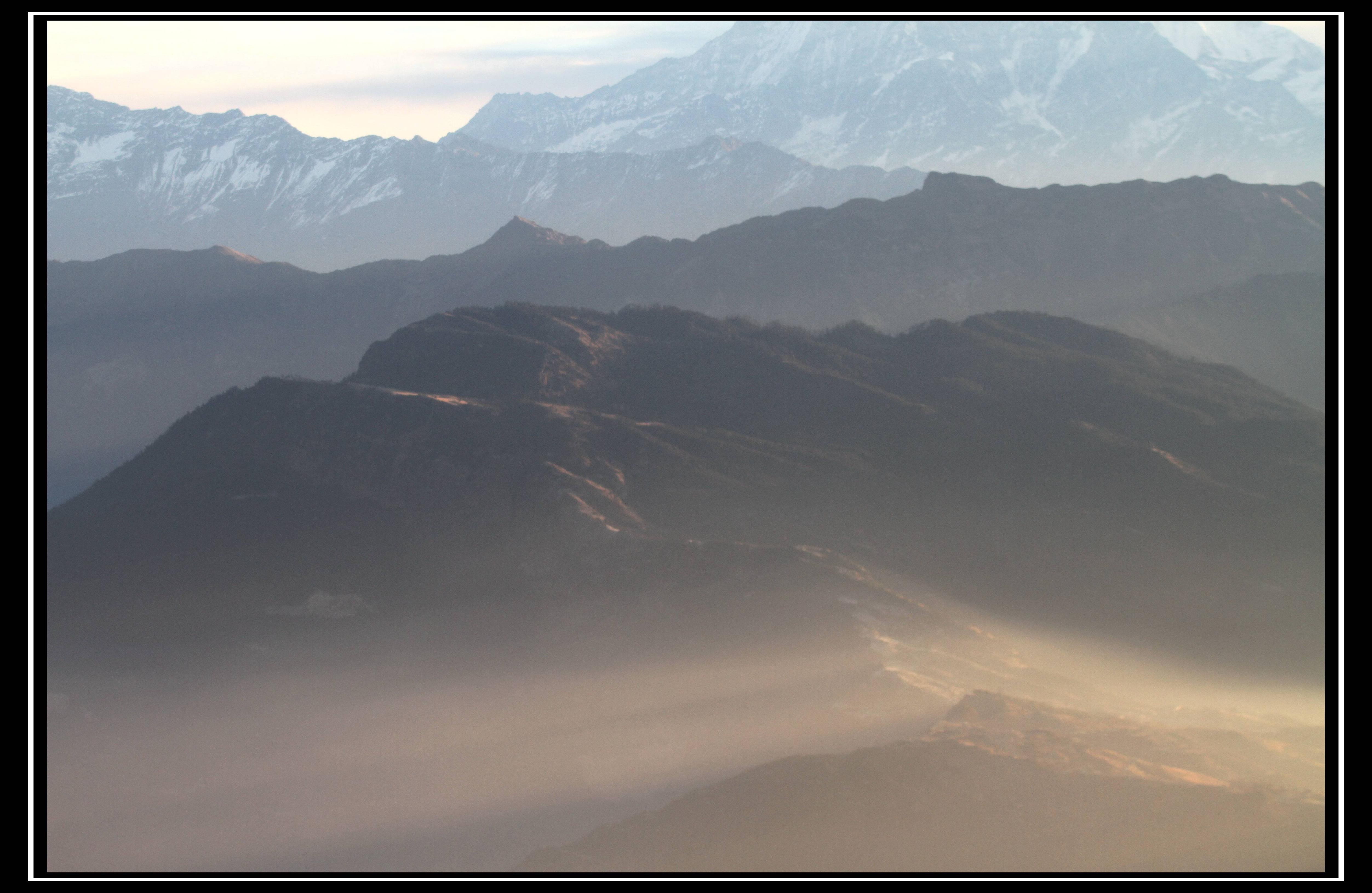 阳光穿透了薄雾,那温柔的光束悬挂在山脊上,仿佛那山也将飞翔起来。远处的雪山缄默不语,此刻它们也愿静静地做世界的背景。