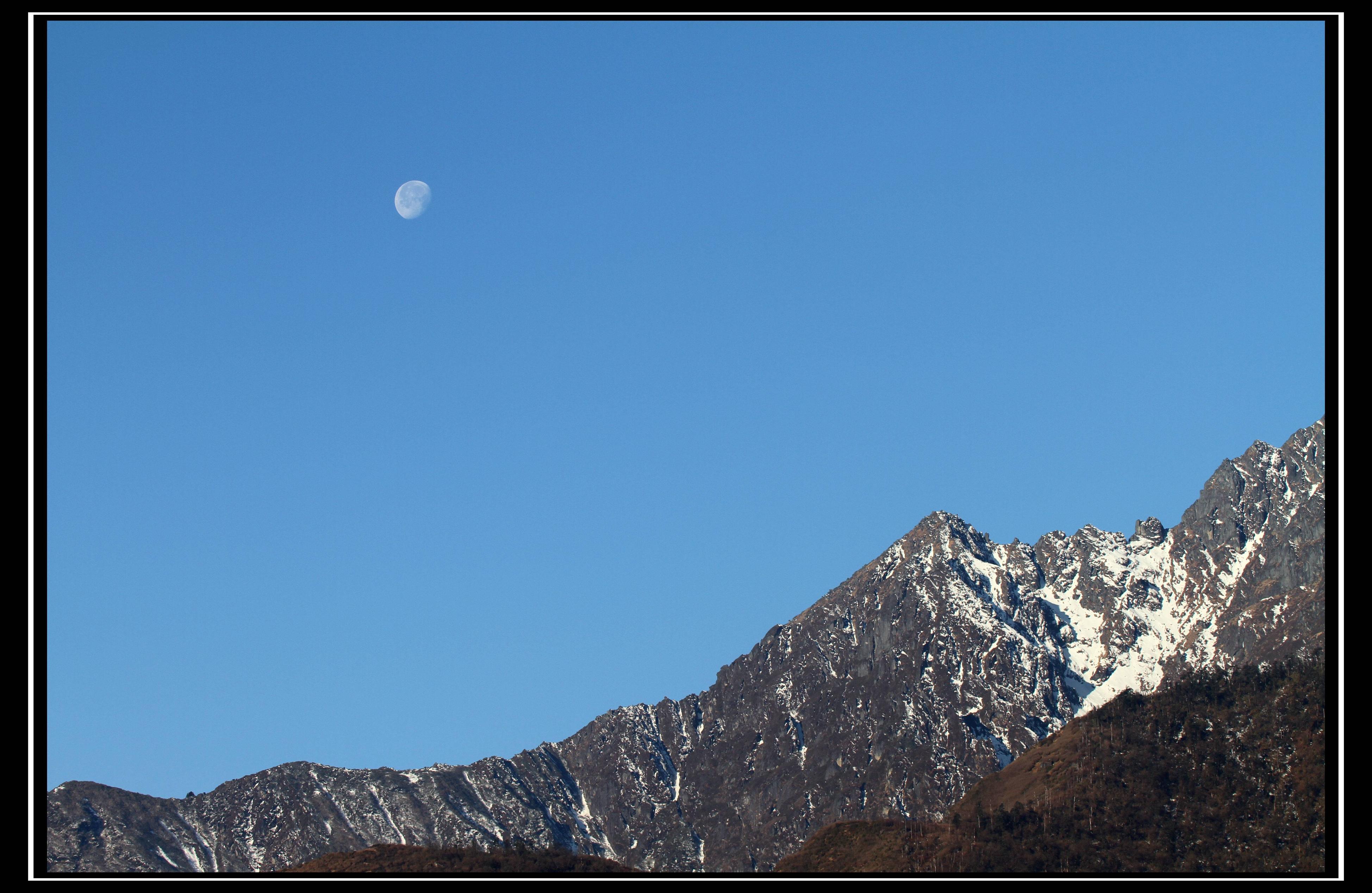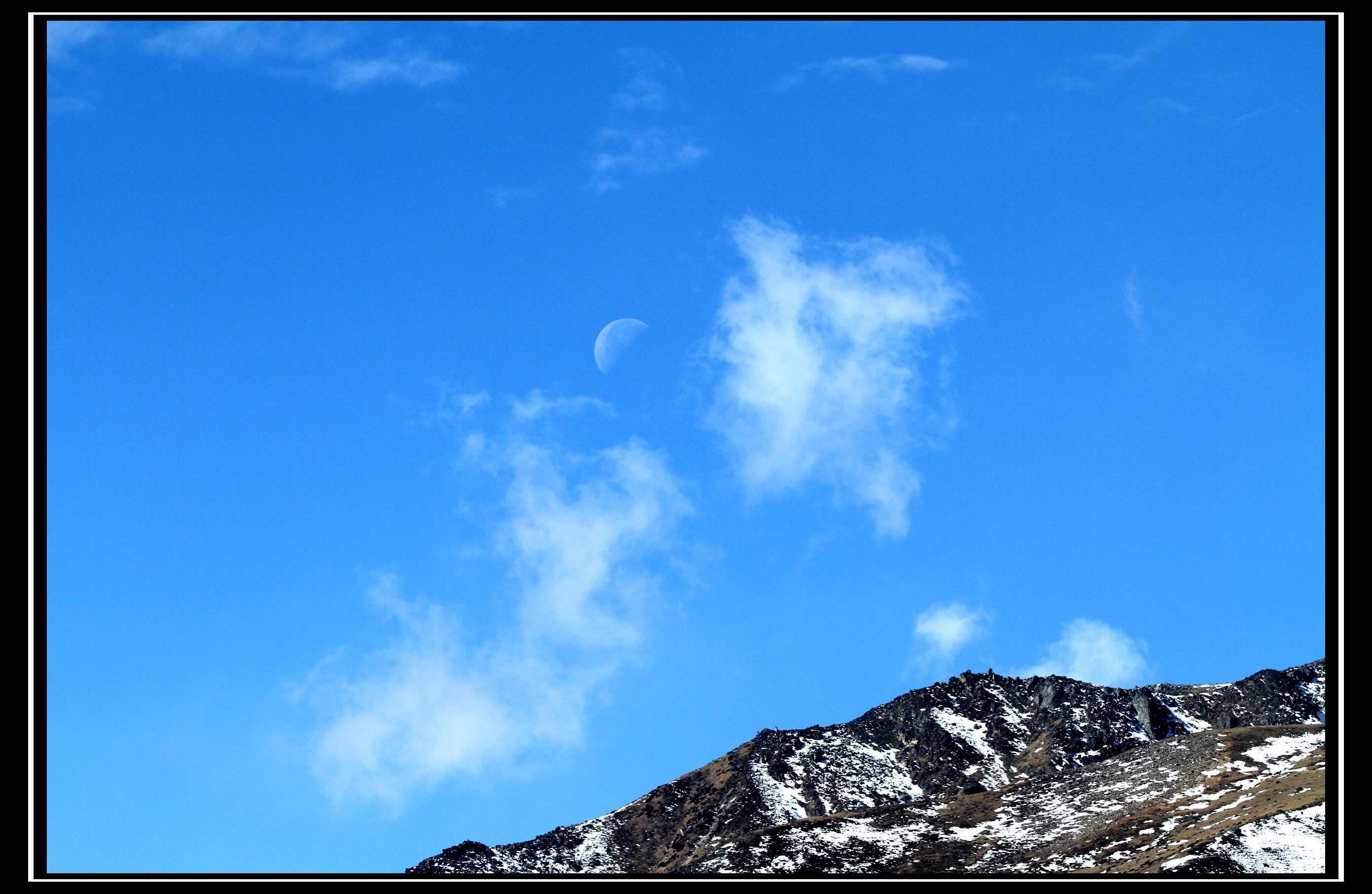 到达卢卡拉的时候也就早上九点。月亮还挂在那山的上头呢,那天穹跟洗过一般的干净,一色的湛蓝,莫非是谁把月亮画上去的?