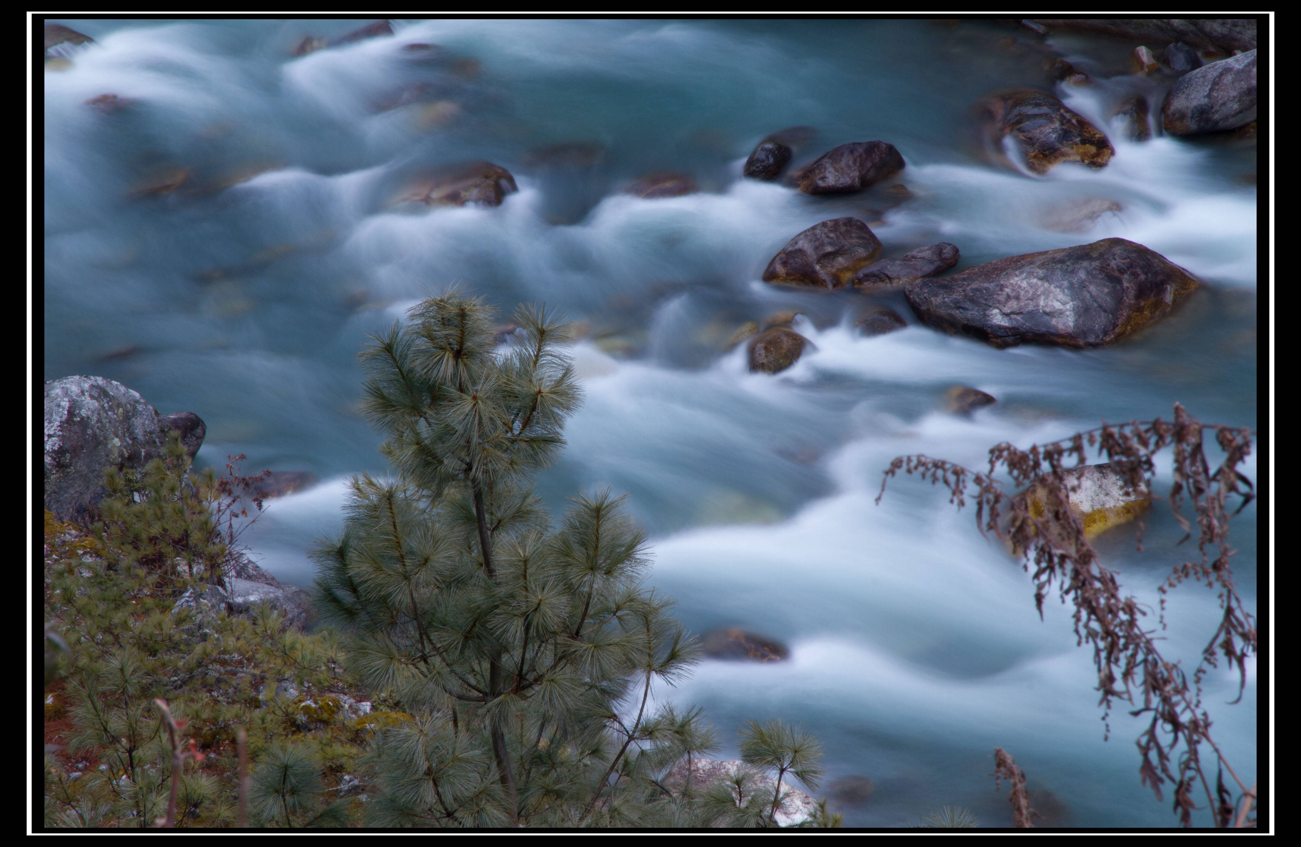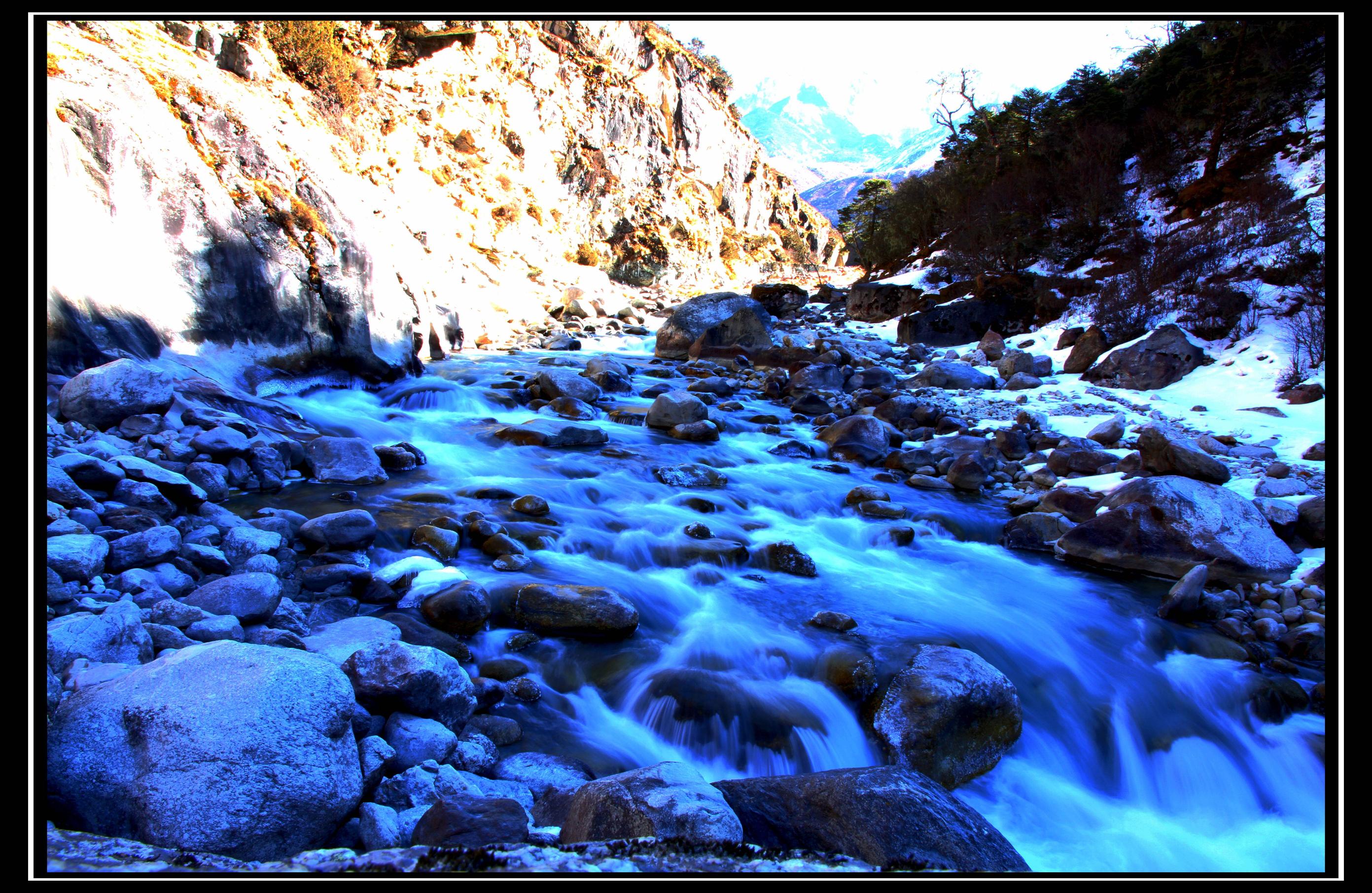 也有湍急的水流,从大大小小的石块中间倾泻着往下流。