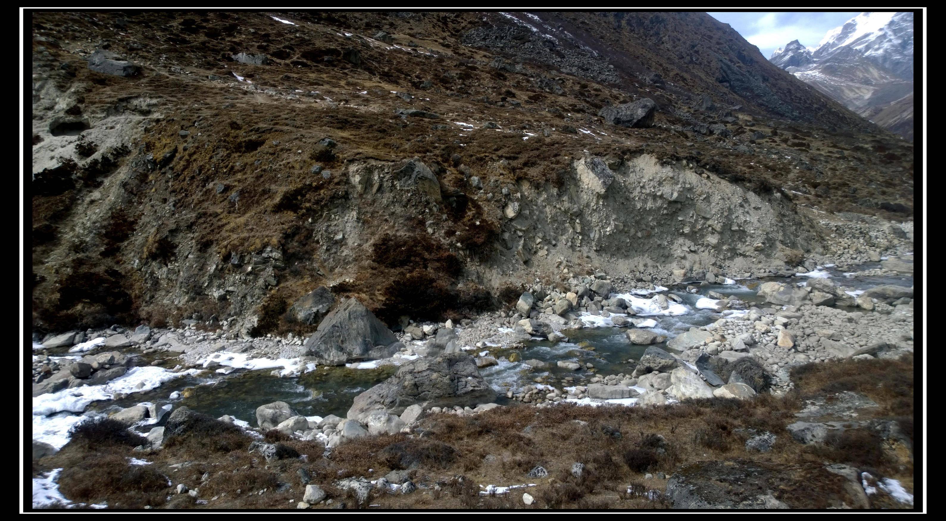 到了门口,你才发现原来这里跟雪山还隔着一条河。河边还星星点点地积着残雪,一直往上绵延,衔接着Ama Dablam峰群。