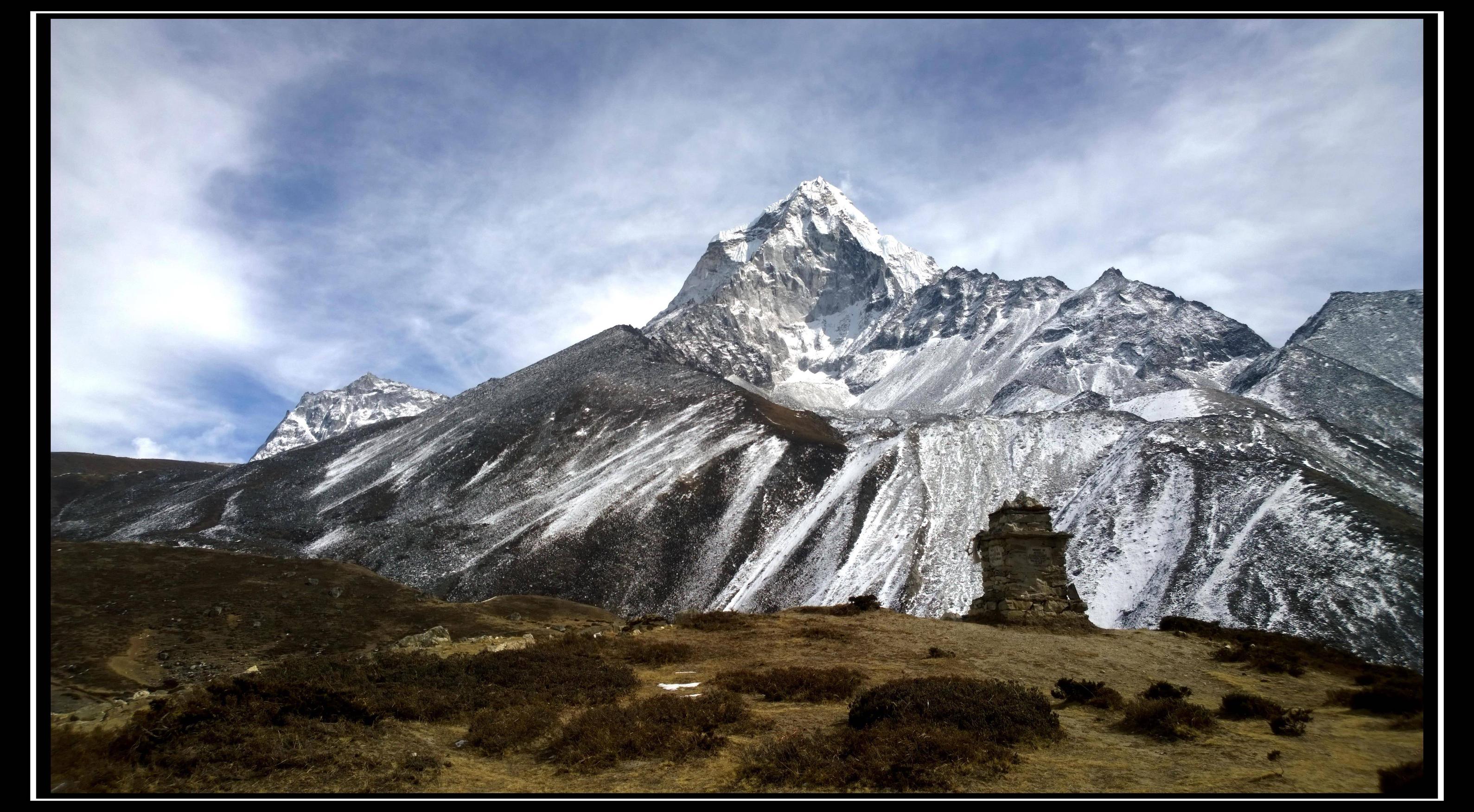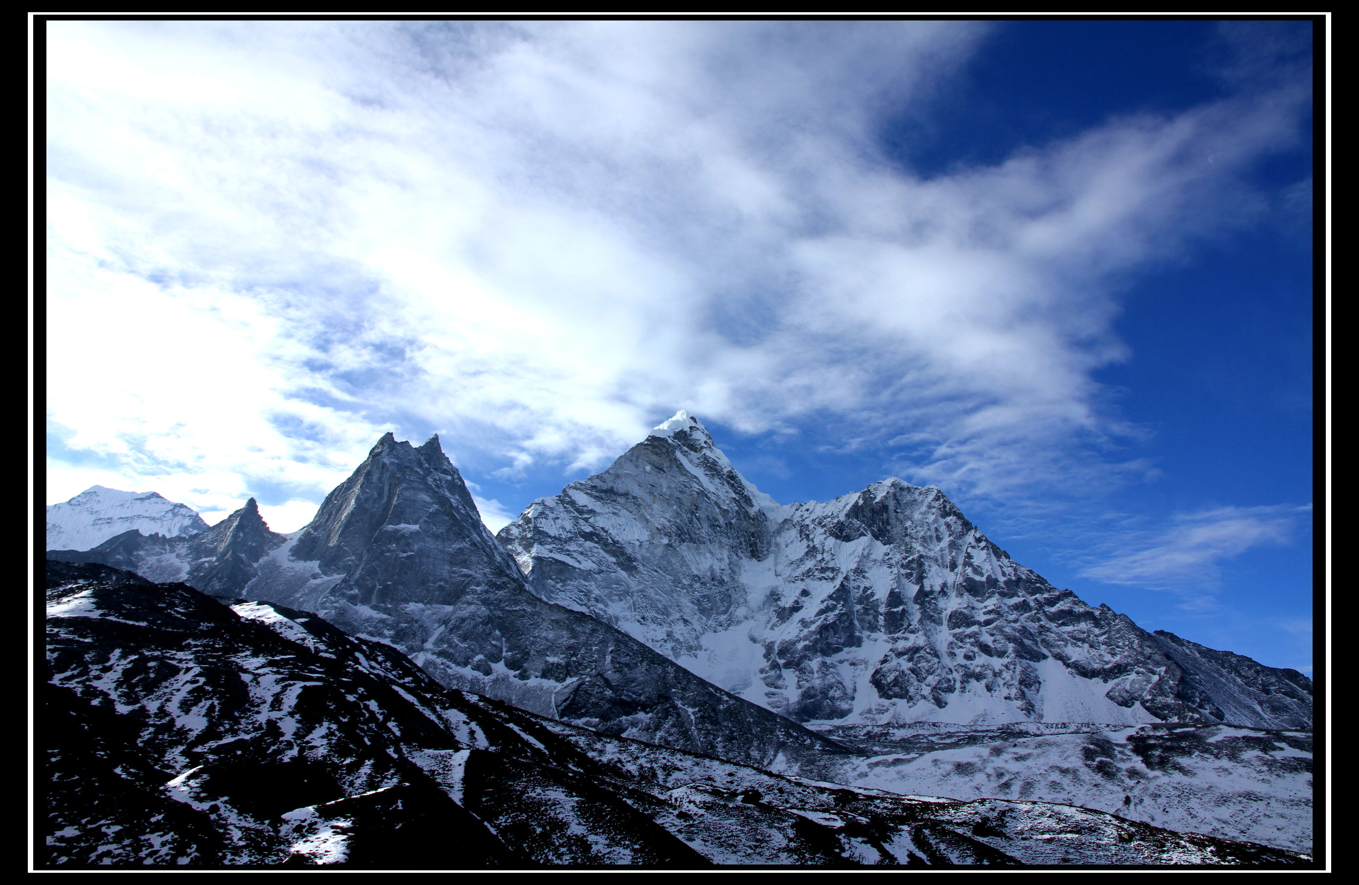 Ama Dablam,这座EBC途中魅力犹胜于珠峰洛子的山峰,大半程都陪伴着我们的行走,Ama在尼泊尔语里面是母亲的意思,Dablam则是项链,“母亲的项链”,一路绵延,仿佛展开了双臂保护着自己的孩子,所以是很多尼泊尔女人祭拜的一座山峰。