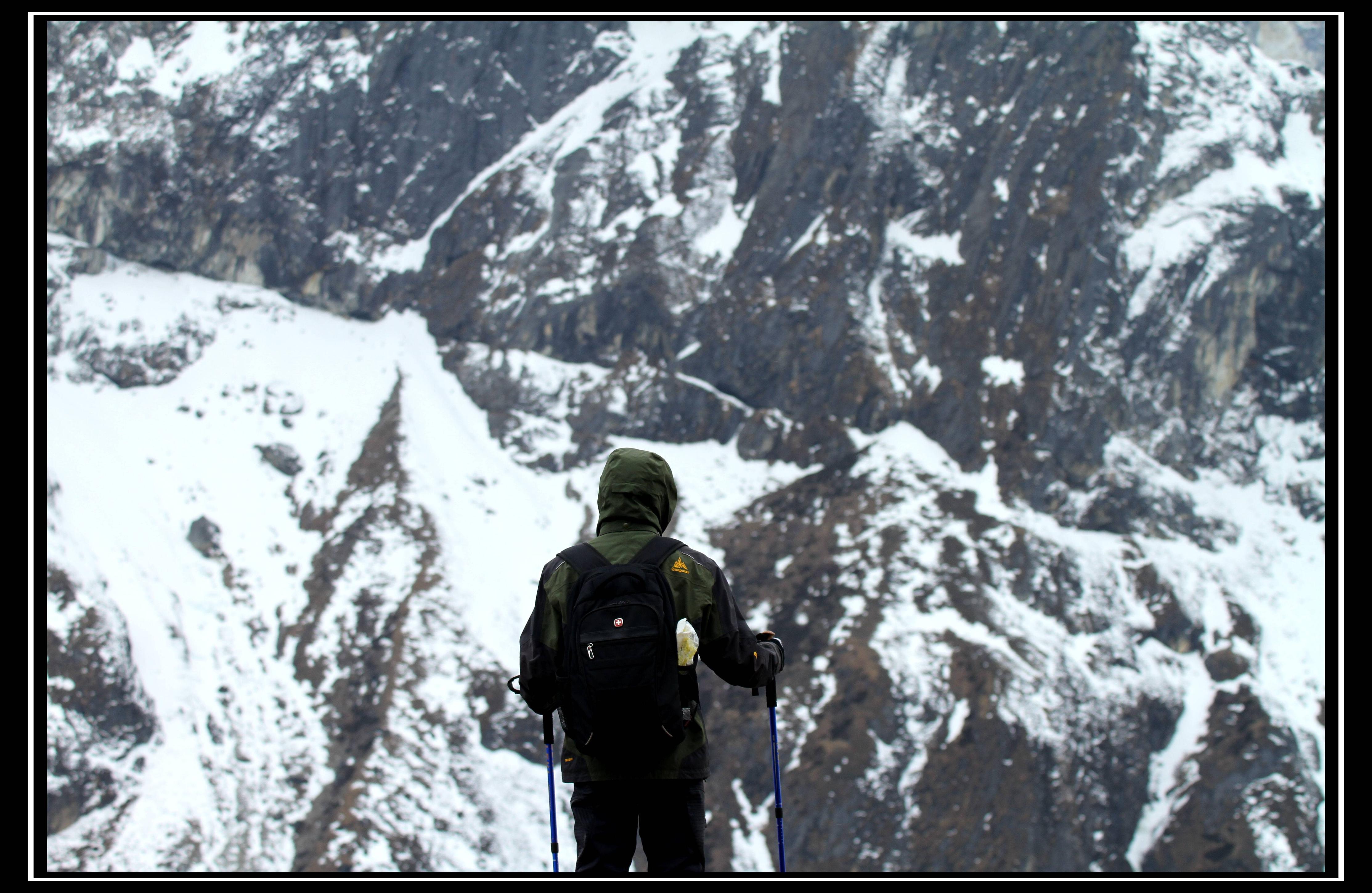 这一路艰辛,一路风雪,也忍受稀薄而干燥的空气,也承受单调而昂贵的伙食,靠的是内心那强烈而坚定的向往,为了站上更高的地方,为了看到更美的风景。所以,当你站在这个几乎无处落脚的所谓的观景点,举目四望,近的远的高的低的雪山绵延不绝,天跟云都是那样的低,仿佛触手可及,那些曾经需要抬头仰望的雪峰,现在基本上可以平视了。你觉得满足极了。