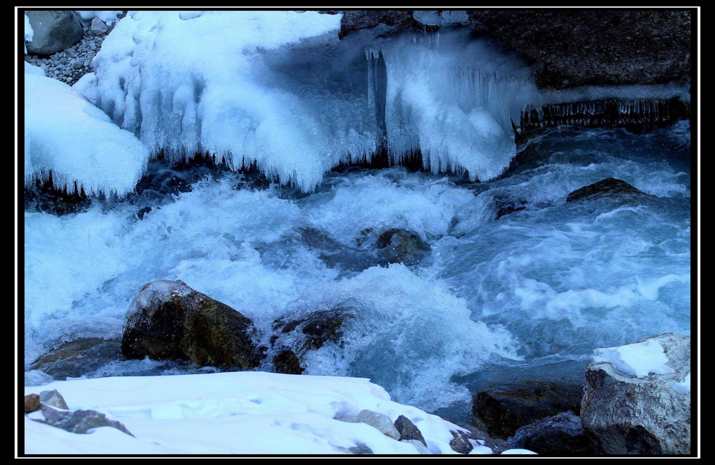 一路过了不少这种结了冰的小溪,小心翼翼地踩着石头过,怕滑,也怕冰碎了陷进窟窿里去。