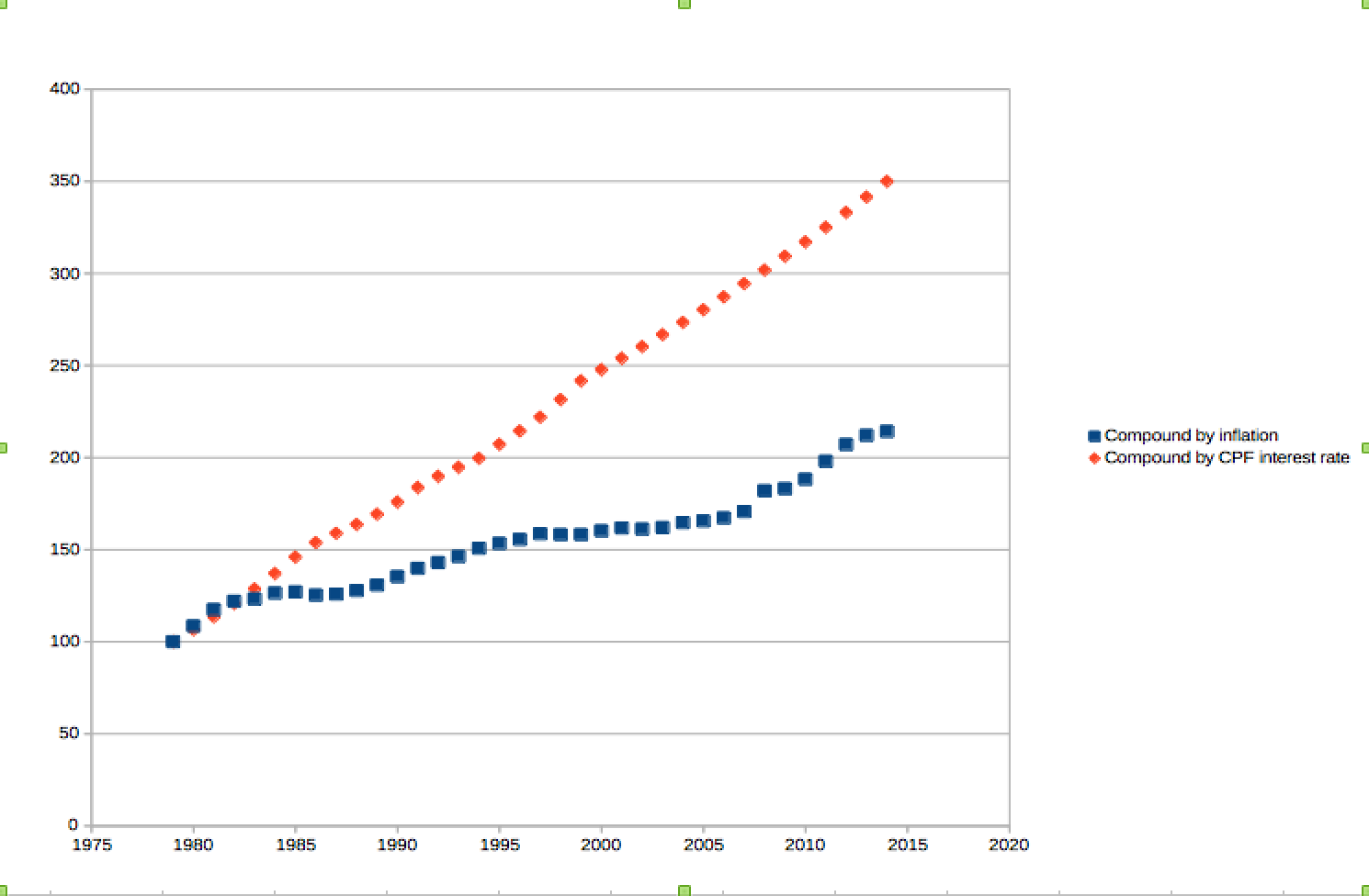 1980年初的100块钱按照CPF利率增长,2014年底成为345. 如果按照通胀率增长,2014年底成为214.