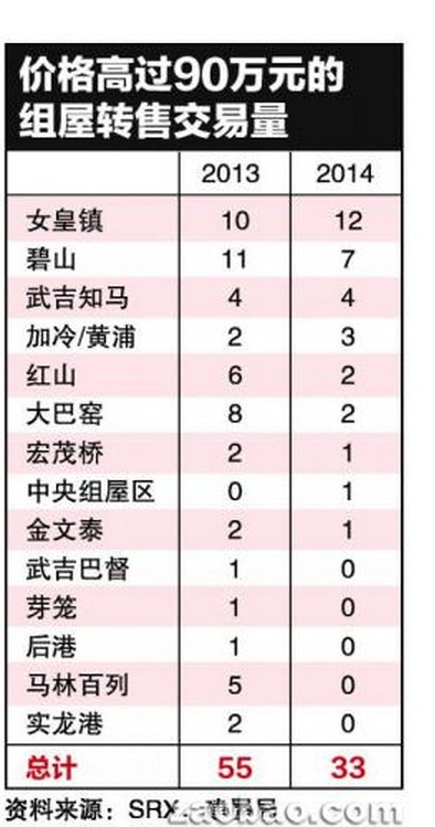 房产博士 • • 58199 次浏览房地产联合交易网SRX数据显示,以至少90万元的价格成交的转售组屋单位去年仅有33个,比2013年的55宗交易锐减40%,是2011年以来最少的一年。