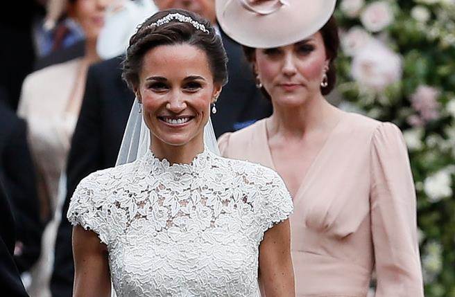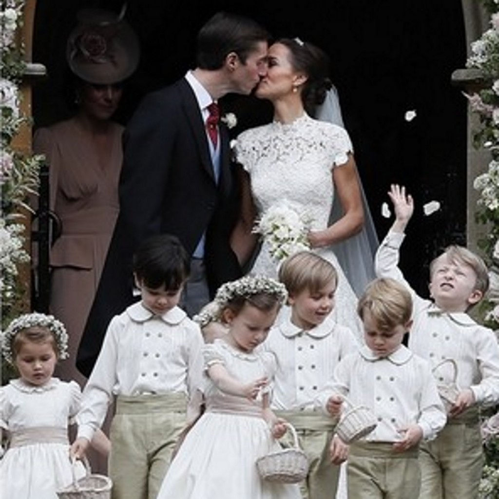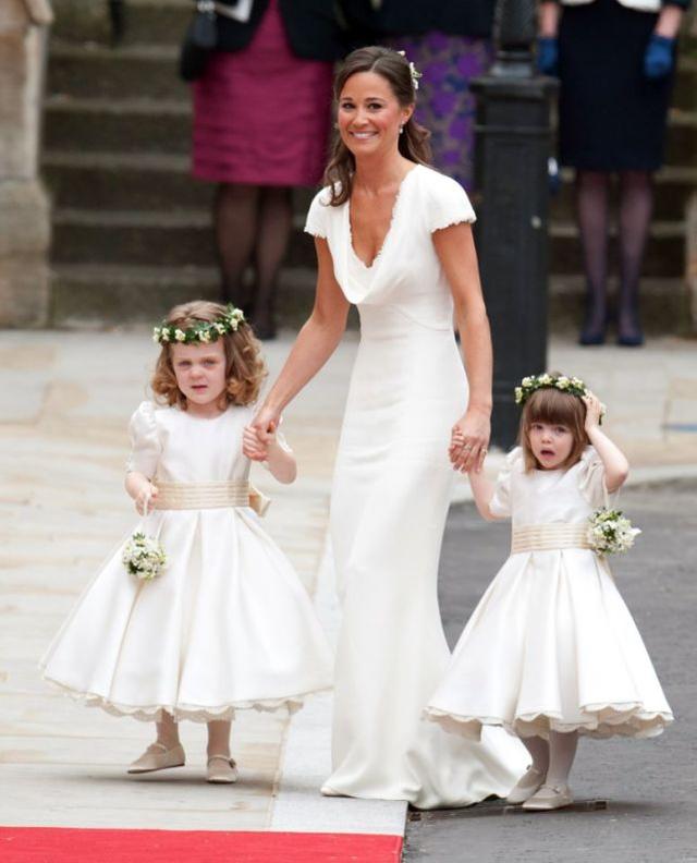 上周六20日,碧琶身穿简约蕾丝高领白纱,乘坐敞篷礼车抵达教堂。凯特身穿淡粉色套装,带领众花童在教堂外等候。