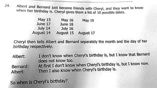 其实这个答案是公开的, 要的是理解推理过程排除18,19两个单独的日子时, 同时排除6月是可能的, 因为6月剩下的只有一天, 为什么也可以排除5月?还是有两天啊,这样A知道月份,B知道日子,还是没有档案啊排除18,19两个单独的日子时, 同时排除6月是可能的, 因为6月剩下的只有一天, 为什么也可以排除5月?还是有两天啊,这样A知道月份,B知道日子,还是没有档案啊