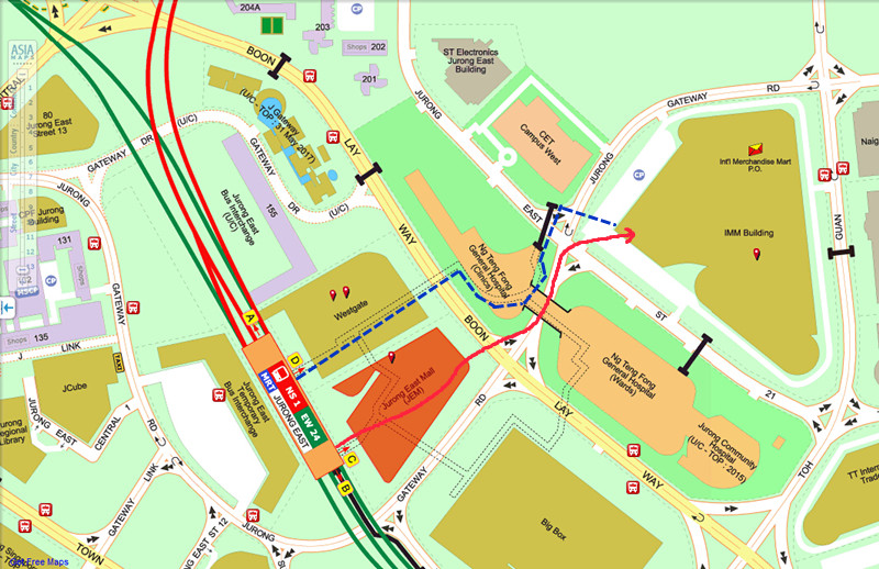 目前最近的路,是 MRT 刷卡处来,二楼去 JEM(而不是 WestGate),下到一楼到商场另一边出门,然后过马路,穿过马上要建好的黄庭芳医院(Ng Teng Fong Hospital)的跨街廊桥,再过马路,就到 IMM 了。图中要经过两个红绿灯,还要忍受短暂无遮挡日晒。全程 5-6分钟。等黄庭芳医院下半年运营后,最方便的是蓝色路线,地铁刷卡处直接联通到 IMM 对面的 CET,全程在二楼,全程在商场/医院/有遮挡天桥上。至于等 shuttlebus,似乎太没必要(除非下雨)。