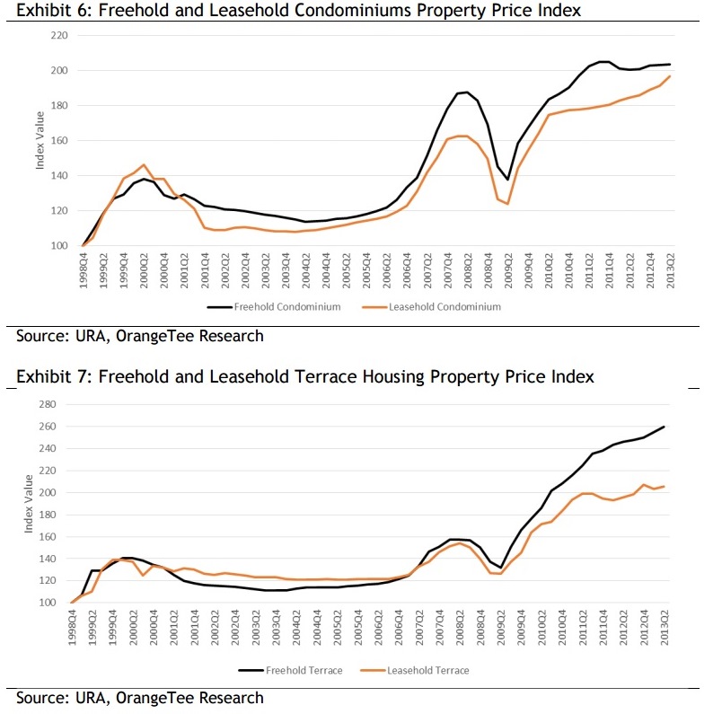 URA有leasehold和freehold的比较分析,从1998年到2013年,比较了Condo和Terrace在几次房价上升和下跌期的变化。长期来说,freehold会比leasehold好些,有地住宅terrace会比较明显。请看下图: