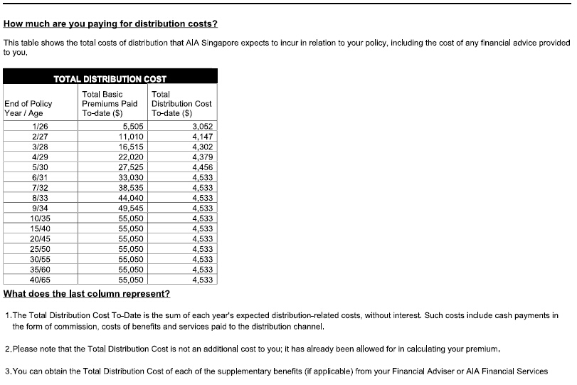 包括经纪佣金,Underwriting,以及各种运营费用等。根据法律,每一份保险的 Benefit Illustration 里,都会清楚的列明这个费用。这个过程往往在推荐产品以及 quotation 的时候就展示的,无需等到客户同意签合同的阶段。实际操作中,客户往往会更多的 concentrate on 保障额度(Sum Assured for Protection)和保单价值(Policy Value for Surrender)两块内容,毕竟这两块是客户最终到手的,并且是展示在前几页的。实际上只要你再看下去,马上就是 “Total Distribution Cost” 和 “Table of Deductions”部分(这一部分也叫“机会成本 —— Opportunity Cost”),清楚告诉你所有信息。以下是 AIA 某个产品的这两部分的截图。我相信其他公司产品也是以类似方式展示成本。