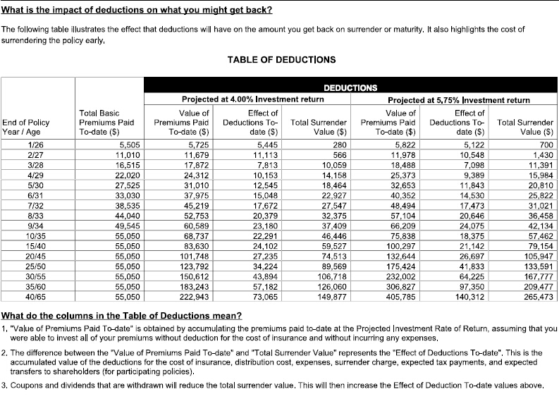 具体到你的问题,那就是如果客户主动问,马上就可以给你答案;如果客户不主动询问,保险经纪或许不会主动强调,但内容也清楚的列在这个 quotation 表格里(即 Benefit Illustration)。