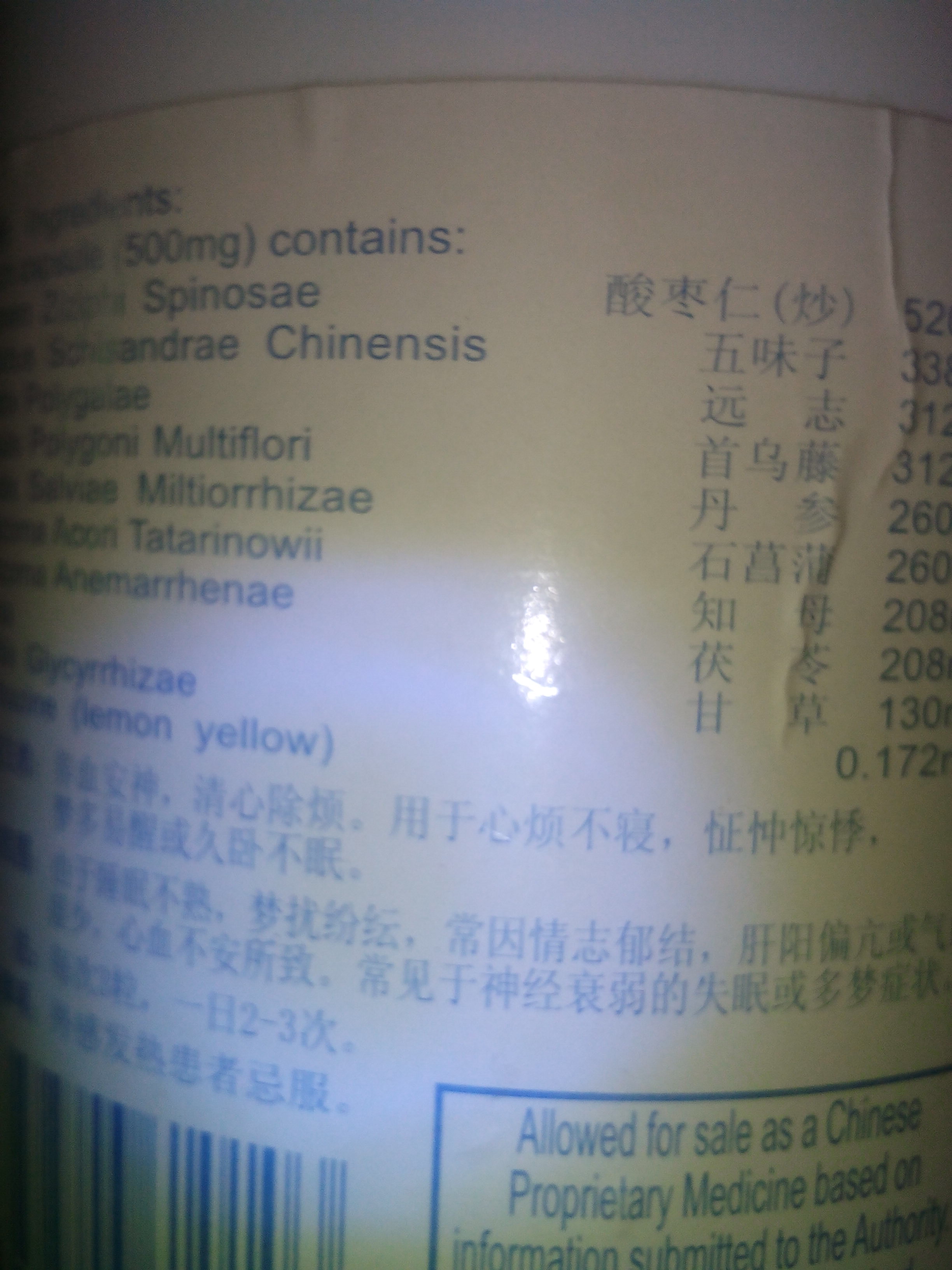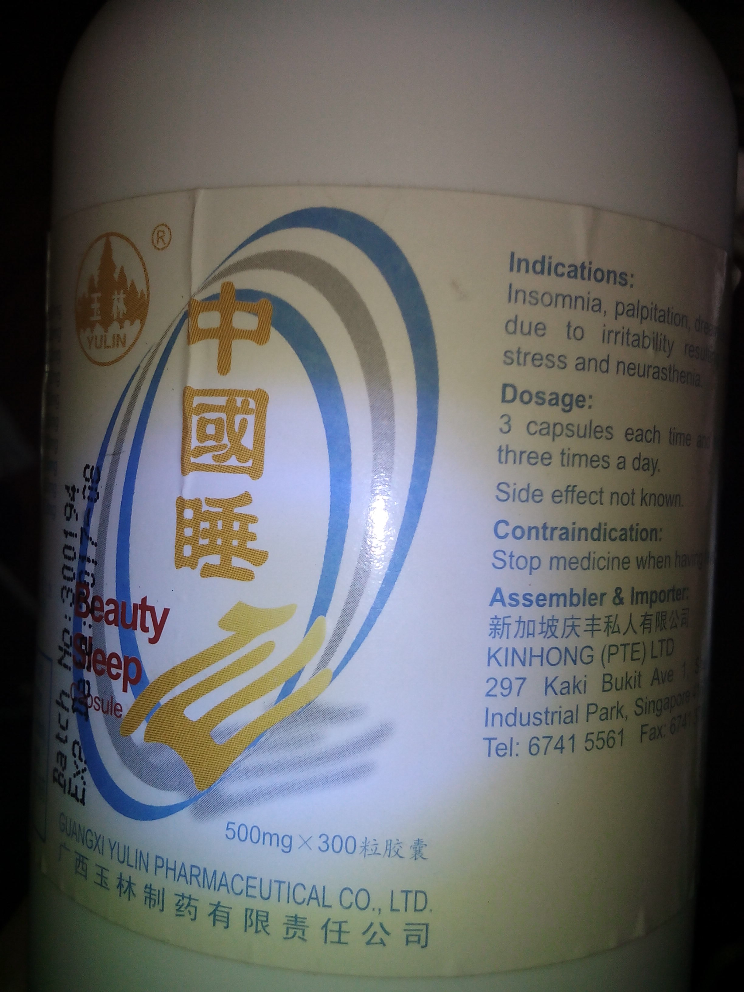 本来以为,就这样了,睡不着就睡不着吧,反正也习惯了,结果一个月前和老公去牛车水买中药,在药店里瞎转的时候,看到有治疗失眠的中成药,就想死马当活马医呗,选了一个试试,比较来比较去,就选了这个“中国睡” (谁让咱爱国呢~),到现在吃了差不多一个月,总的来讲钱没白花,还是有帮助的;现在每天晚上11点前,就有困的感觉了,入睡也相对容易了,虽然也有半夜2,3点瞪眼望天的时候,但是相比以前,次数要少了,偶尔中午在公司,也能午睡个十分八分的。