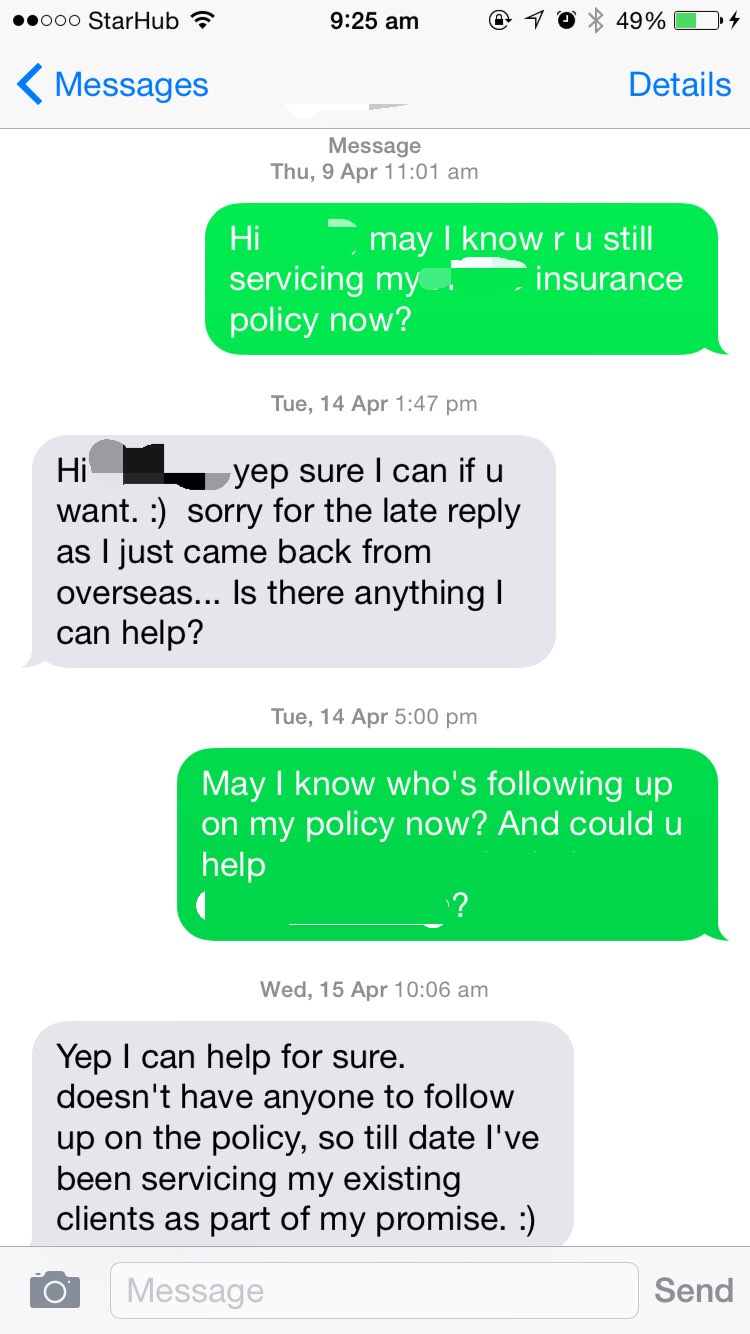 Adabada • • 56943 次浏览两年前很傻很天真的跟某H银行的J小姐买了份保险,最近联系她才知道她已经不在H银行做了,然后我的policy也没有人follow up,发短信给J小姐,她还信誓旦旦说自己还会service自己以前的客户作为自己对客户的承诺,但是从上个礼拜开始发了几条短信给她都没有回了…找H银行的客服说要换保险经纪,被告知没有人要接单。