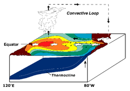 ENSO形成的原因,科学界有多种观点,比较普遍的看法是:在正常状况下,北半球赤道附近吹东北信风,南半球赤道附近吹东南信风。信风带动海水自东向西流动,分别形成北赤道洋流和南赤道暖流。从赤道东太平洋流出的海水,靠海洋底部的涌升流补充,由于底层海水温度较低,因此使表面水温低于四周,形成东西部海温差。但是,一旦东风减弱,甚至变为西风时,赤道东太平洋地区的冷水上翻减少或停止,海水温度就升高,形成大范围的海水温度异常增暖。而突然增强的这股暖流沿着厄瓜多尔海岸南侵,使海水温度剧升,冷水鱼群因而大量死亡,海鸟因找不到食物而纷纷离去,渔场顿时失去生机,使沿岸国家遭到巨大损失。