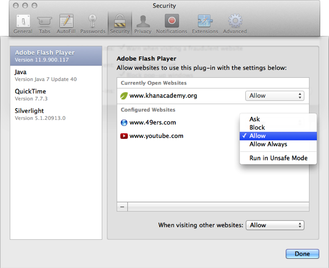 2. 在Safari的Preference-》Security-》Internet Plugin:Website Settings-》Java下,click“Run in Unsafe Mode”。