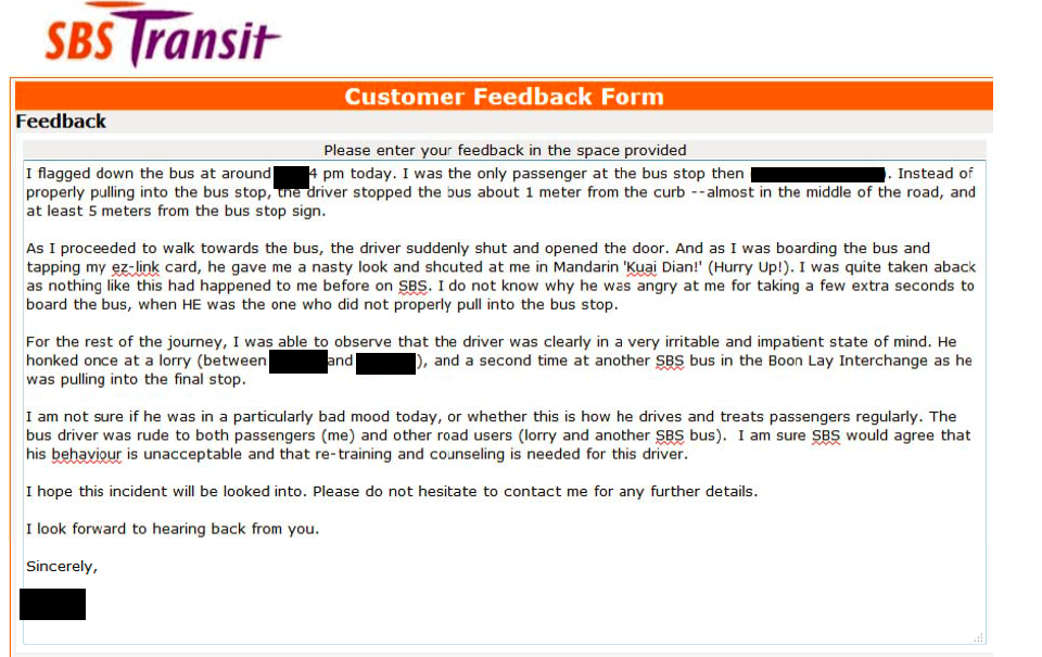 言而总之,别学的新加坡人动不动就complaint,不喜欢这样的人....我也常常挥手了,司机却没有停车,当时有点生气,或者跟朋友抱怨下,但是后来想想,每个人工作的时候都会有点失误之类的吧,或者是人太多司机没看到....