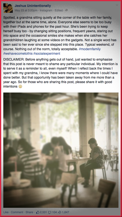功夫熊猫 • • 56391 次浏览一名网友Jeshua早前目睹,一位婆婆在家庭聚会中,被家庭成员冷落在一旁,只因为家人手中都捧着电子产品玩乐,而婆婆只能静静地坐在一个角落;在整个过程中,没人和婆婆说过一句话。
