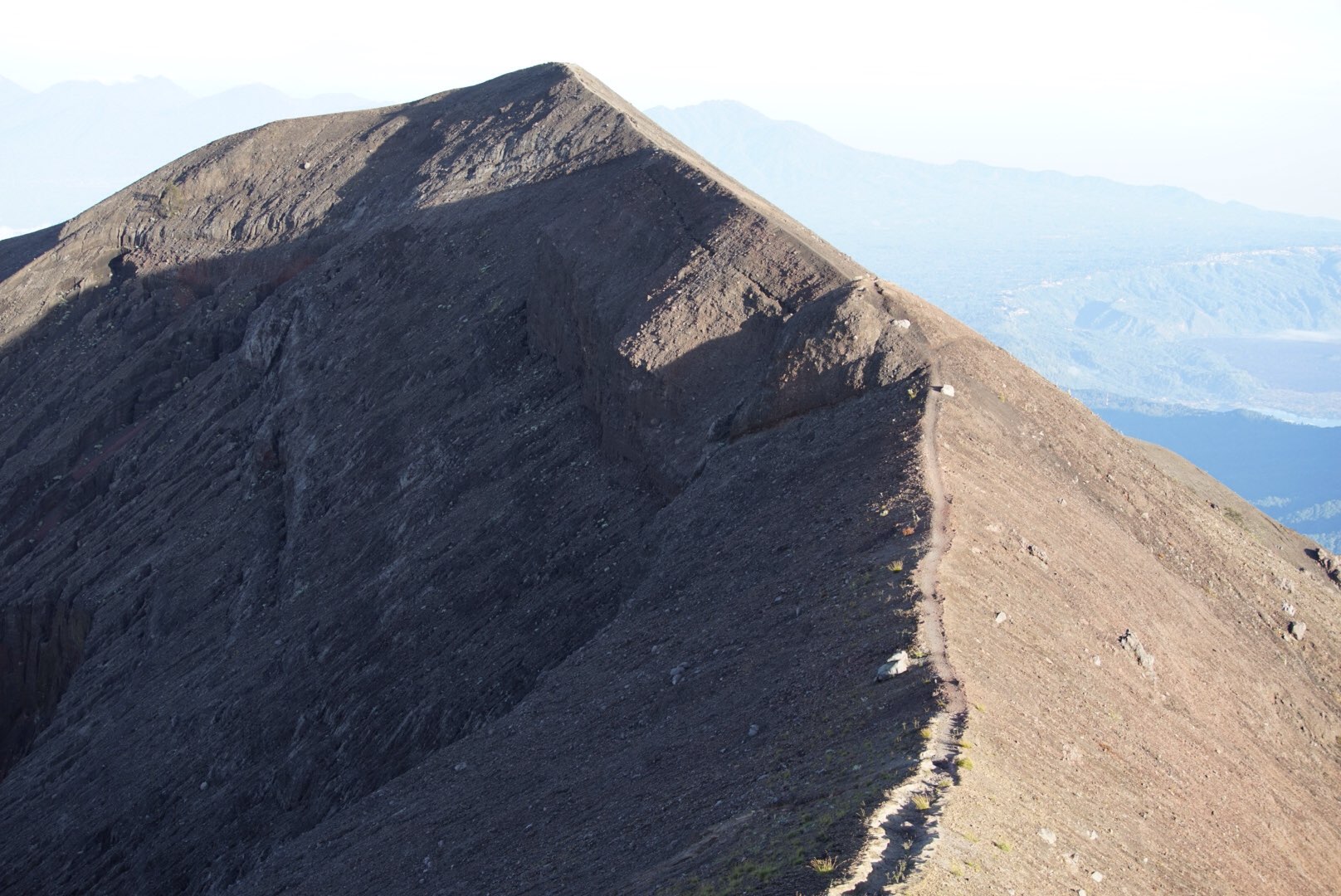 道路大概分三段。先是阔叶林,大概1小时多点吧,非常好走,下过雨略滑。第二段针阔混交林,极滑,地上都是球状多孔火山岩,一旦踩上滑动摩擦就变滚动摩擦啦,lz下坡摔得遍体鳞伤啊。路有时会很险,一或两面是山谷。另外这段路非常窄,也就一二人宽,较陡。第三段是裸露的岩石,大概3小时。视野极好,向上到顶峰,向下bali各城镇都一清二楚。很陡,但不滑(风大,小石头都吹走了),但是更要小心因为万一滑倒就不知道滚山下哪去了。下山尤其吓人。