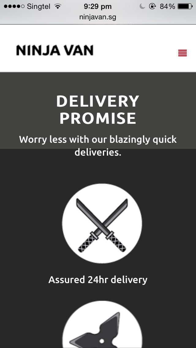 赞+1 昨天刚收到ninja送来的快递 超棒!很多本地的网站都用这一家 超贴心 每次会sms提醒你哪一天送货~送到之后还有邮件提醒~很多本地的网站都用这一家 超贴心 每次会sms提醒你哪一天送货~送到之后还有邮件提醒~