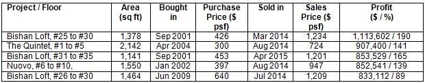 The highest profit of $1.1 million or 190% was traced to a unit at Bishan Loft (See Table 2). The owner had purchased the unit direct from developer NTUC Choice Homes and Chip Eng Leong back in 2001 for $426 psf. He sold it in March 2014 for $1,234 psf.
