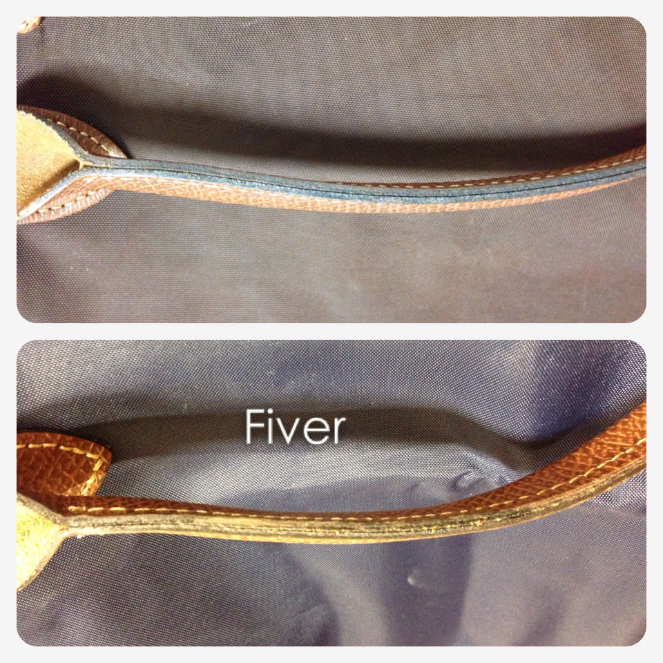 还有就是手柄的油边,我的包包都是工整的黑色油边封起来的,FIVER那个包包的油边就毛毛草草