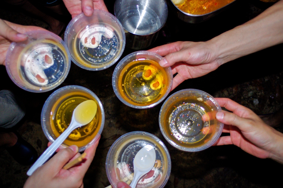 这顿火锅肯定没有坐在好馆子的冷气房里面吃得享受,但是吃得很香。别笑话用沾了火锅油的碗喝饮料,伏特加和威士忌,这种时候这都不是事。