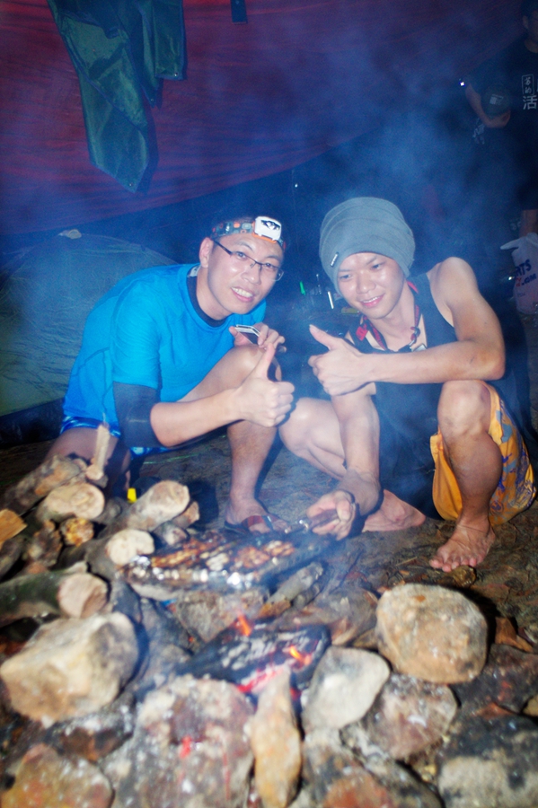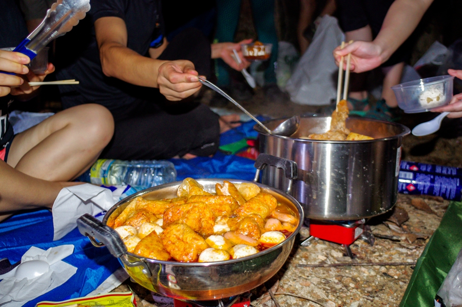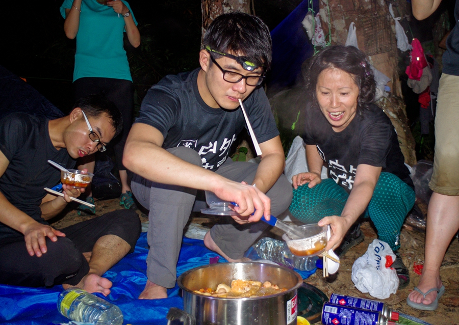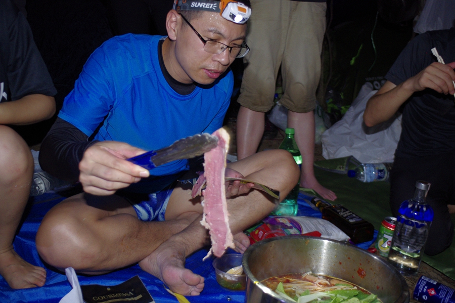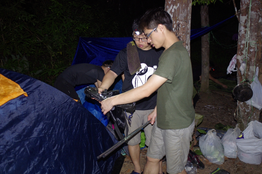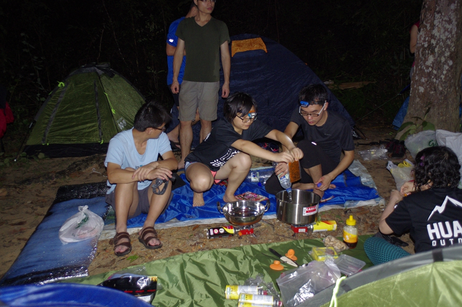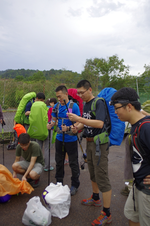 在山脚我们分配各人要背负的公用物资。因这次露营要吃火锅和烧烤,各种食材加上露营装备还是挺重的。 我之前想着小山不要紧因此背了单反和脚架准备拍星轨,负重大概13kg,加上公用物资后是18kg,对于很久没有试过这样的我而言有点不易。不过这对于山导来说太轻松了,他背了35kg。