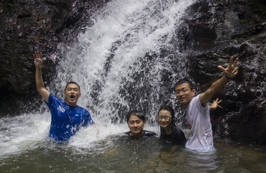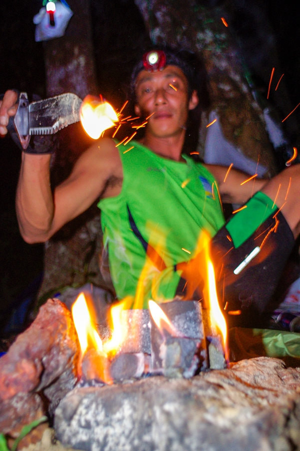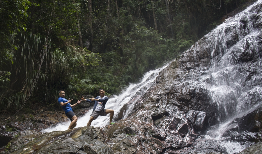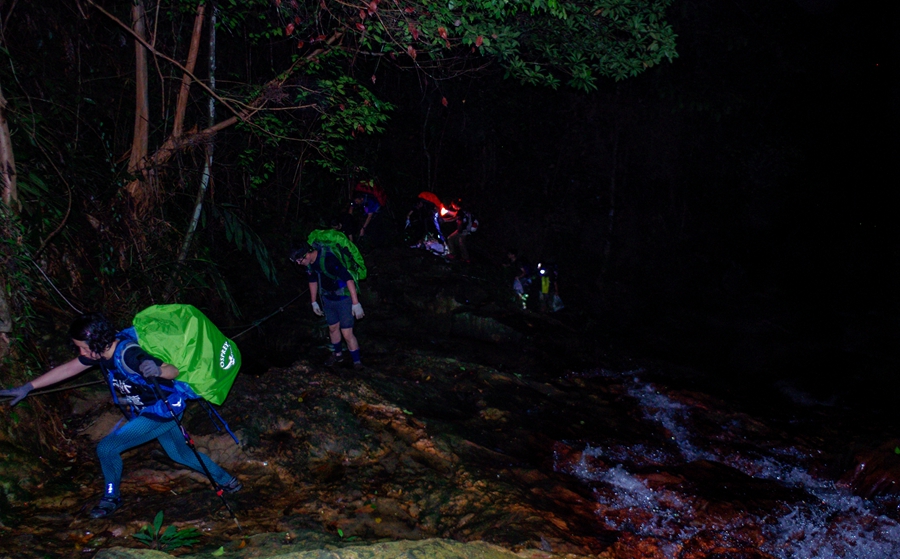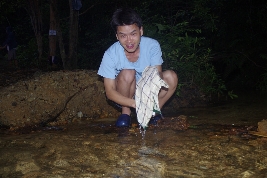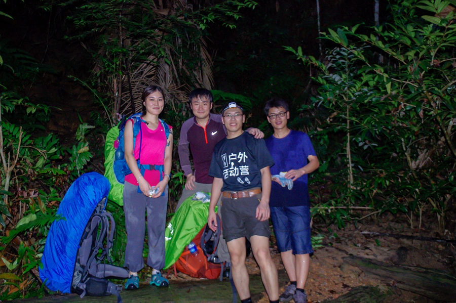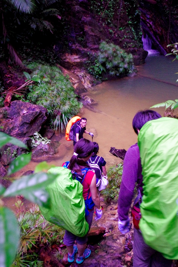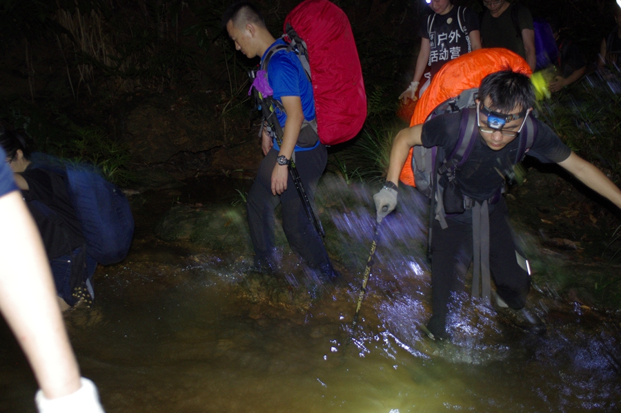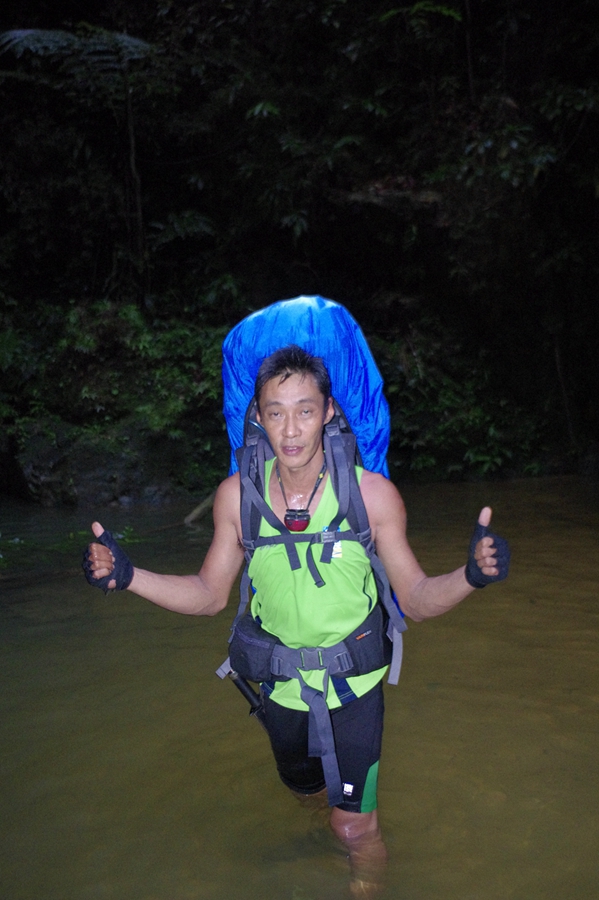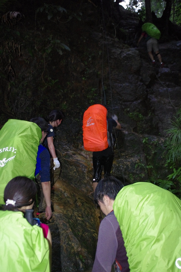 山导。在爬上这个坡后,他带我们几个殿后的下溪水走了一段捷径抵达彩虹瀑布,但是前面的他的助手却把大部分人带错地方,重新集合队伍花了很长时间,之后我们就在完全的黑天里登山了。