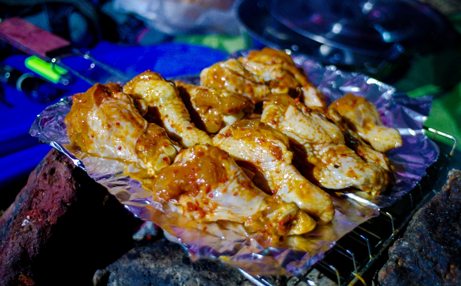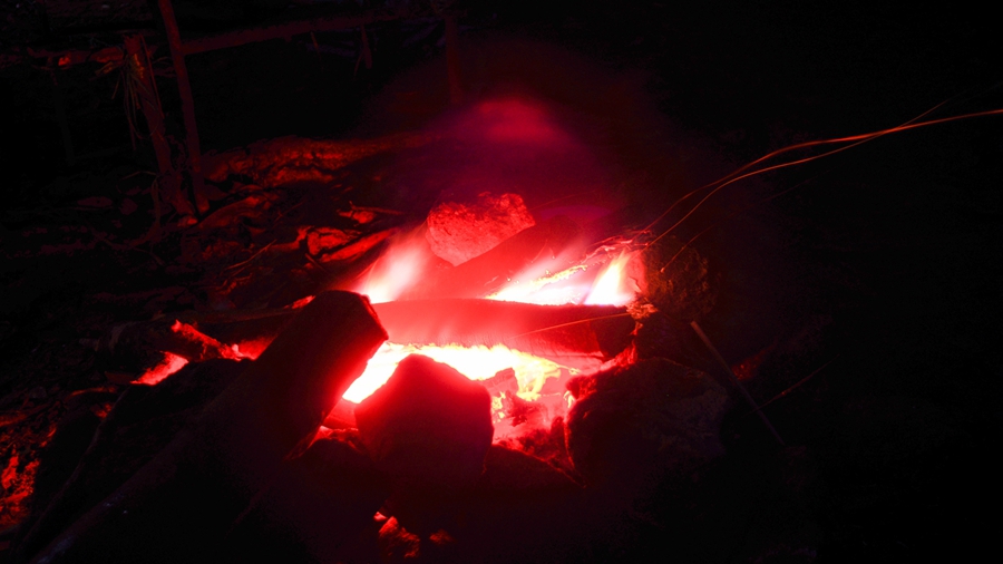 生火,烧烤。一群人围坐着,喝酒,吃烤肉,唱歌,不亦乐乎。