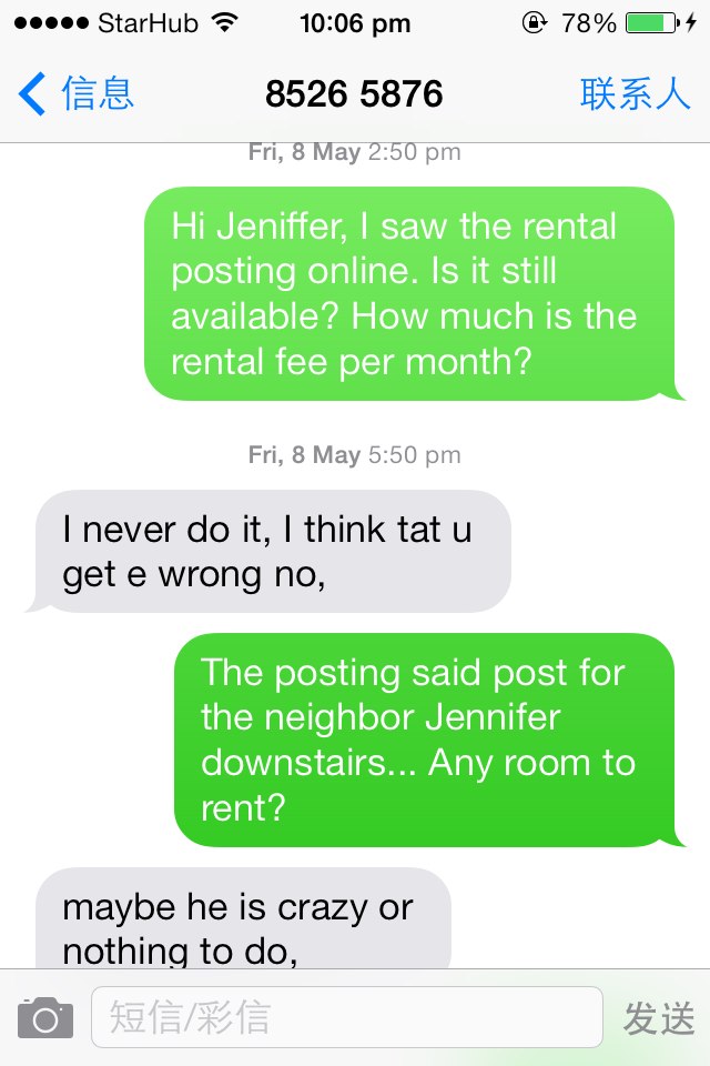 然后5月的时候已经租出去的房子现在这个不知道是jeniffer还是hazel的女的,又开始要找租客了。还把我1个半月前的短信翻出来再打给我,真是无语了。现在这个不知道是jeniffer还是hazel的女的,又开始要找租客了。还把我1个半月前的短信翻出来再打给我,真是无语了。